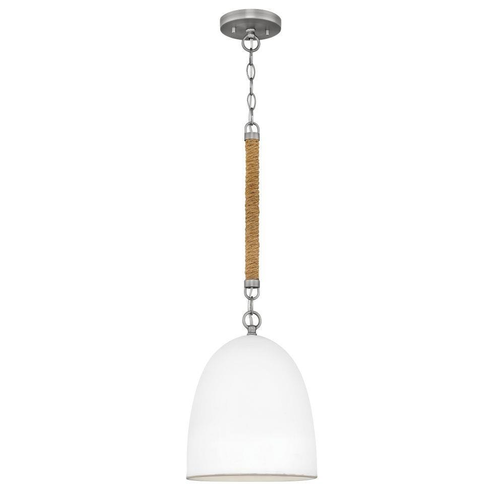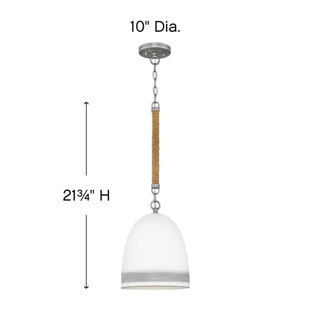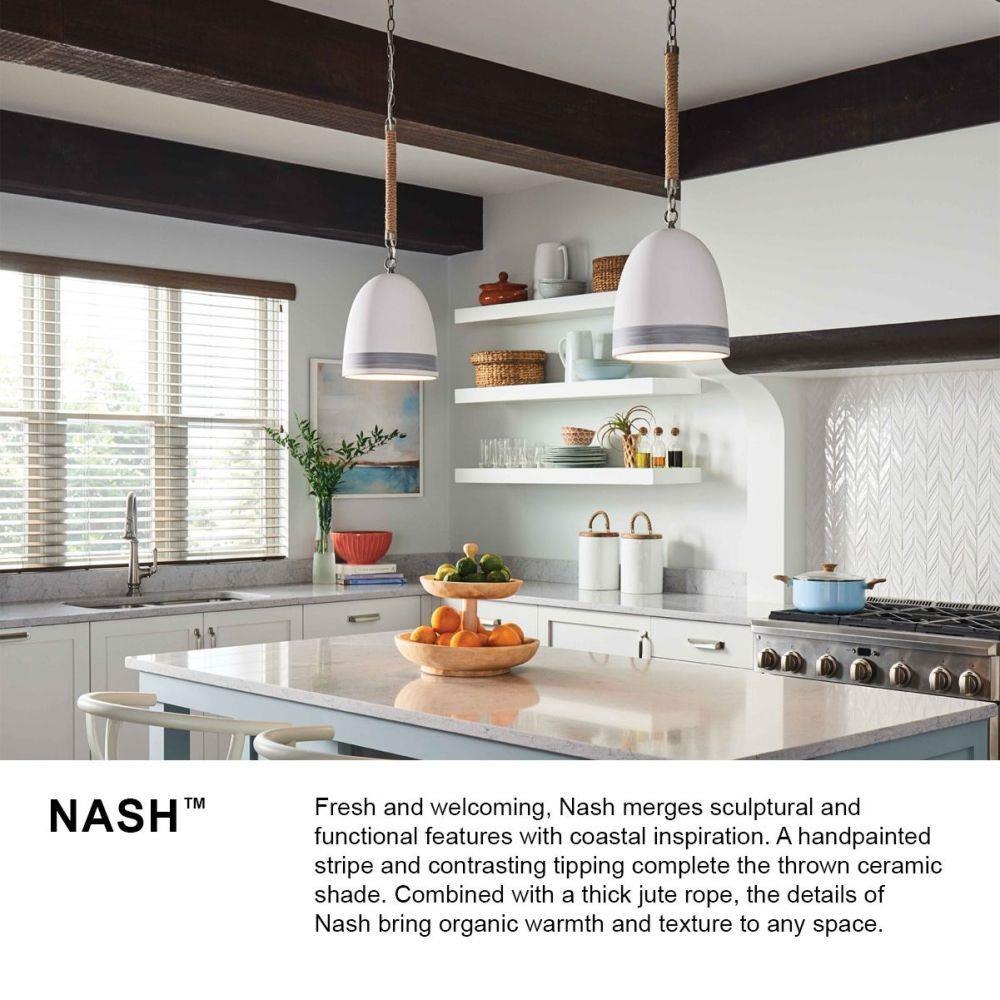 Fresh and welcoming, Nash merges sculptural and functional features with coastal inspiration. A hand-painted stripe and contrasting tipping complete the thrown ceramic shade. Combined with a thick jute rope, the details of Nash bring organic warmth and texture to any space.Suitable for use in dry (indoor) locations as defined by NEC and CEC. Meets United States UL Underwriters Laboratories & CSA Canadian Standards Association Product Safety Standards / This chain or cable hung fixture may be installed on any sloped ceiling / Classic matte brushed nickel finish / Chic, modern design with refined details adds a fresh, minimalist elegance