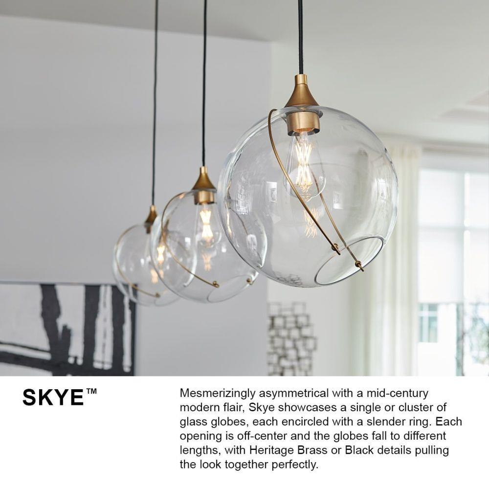 Mesmerizingly asymmetrical with a mid-century modern flair, Skye showcases a single or cluster of glass globes, each encircled with a slender ring. Each opening is off-center and the globes fall to different lengths, with Heritage Brass or Black details pulling the look together perfectly.Suitable for use in dry (indoor) locations as defined by NEC and CEC. Meets United States UL Underwriters Laboratories & CSA Canadian Standards Association Product Safety Standards / This chain or cable hung fixture may be installed on any sloped ceiling / Striking black finish enhances design / Eclectic style that mixes unconventional elements; unique and sophisticated designs that feel modern and vintage at the same time. / The Lisa McDennon Collection offers a striking mix of edgy, sculptural silhouettes that incorporate modern, organic elements and luxe materials, brought to life by her innovative and original point of view.