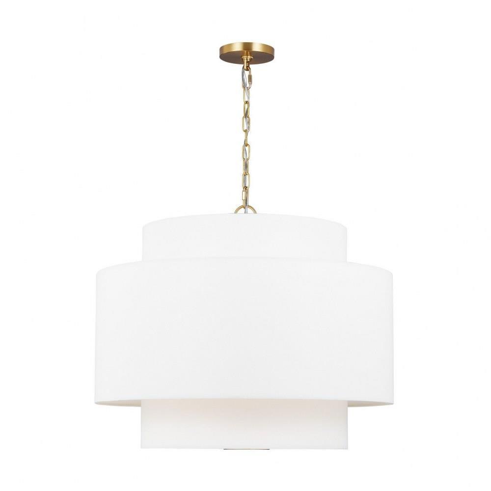 The Sawyer pendant in burnished brass is inspired by kate spade whimsical geometry and playful lines, Sawyer has a striking silhouette with graphically taped shades. A wide double tiered pendant shade with graphically taped shades. Great over a dining table or nook, or in multiples over an island.Product Features and Benefits