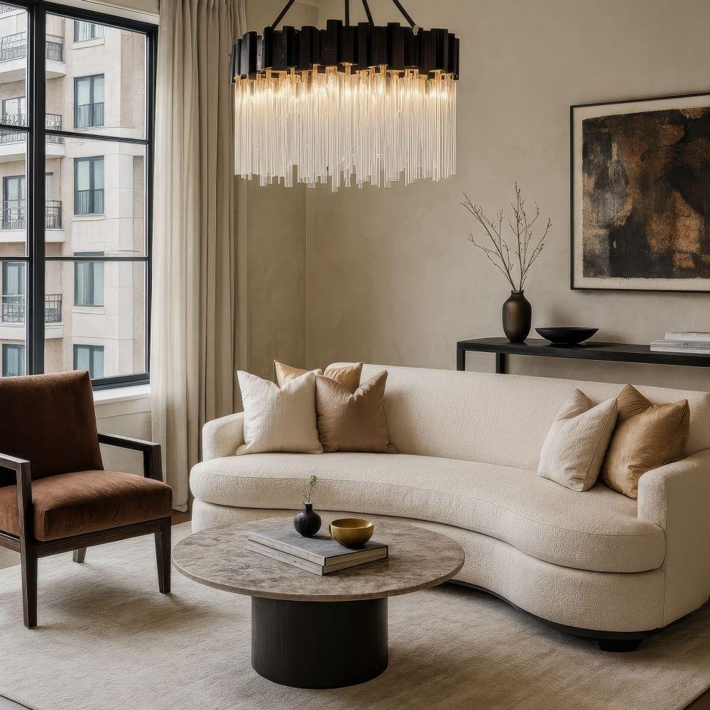 The Matrix Collection redefines lighting with bold geometry and shimmering detail. Featuring hand-forged recycled steel frames paired with hand-cut fluted glass rods, Matrix creates a sophisticated play of light and shadow. Offered in Havana Gold or Matte Black with French Gold accents, this collection embodies modern luxury with an eco-friendly soul.