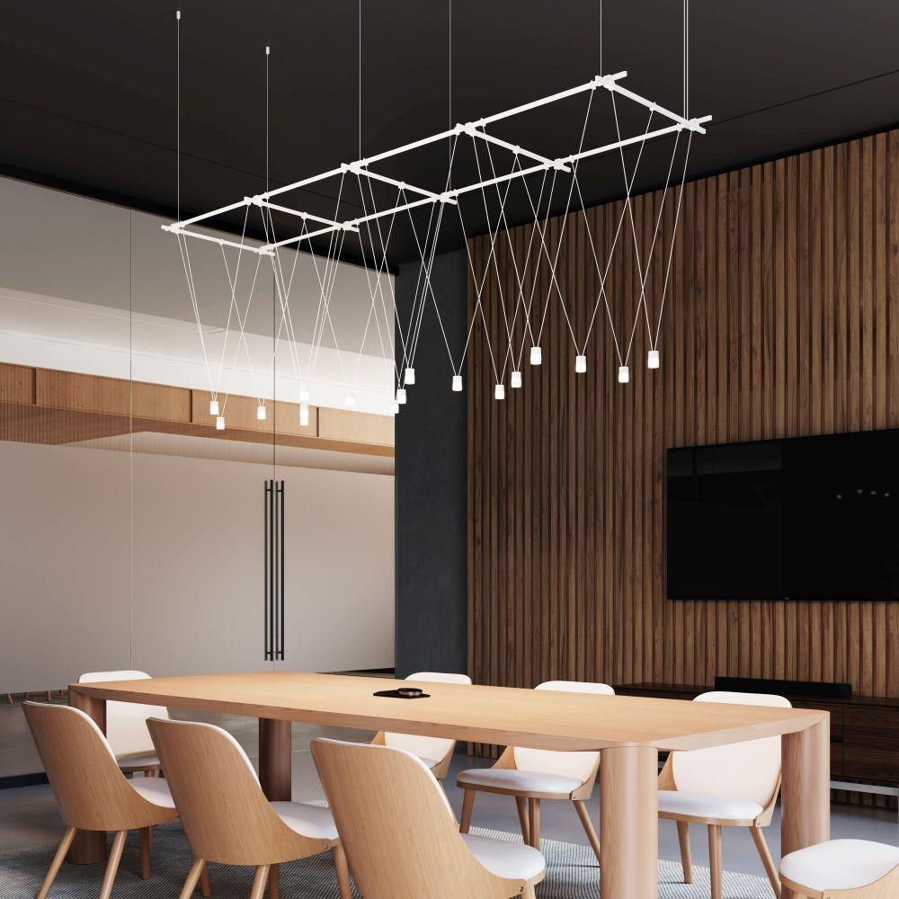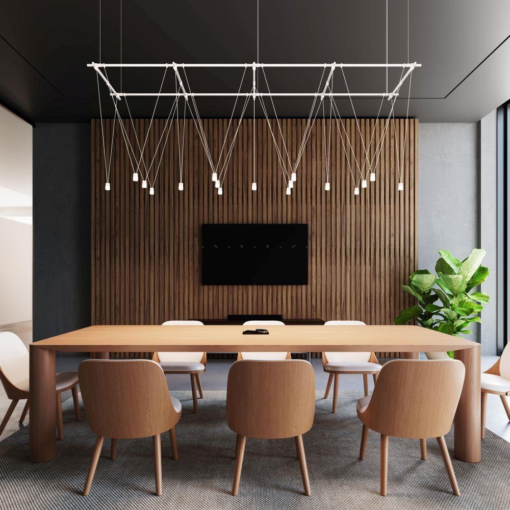 Power bars are suspended at right angles to each other, connected by perpendicular Power Bar Hangers. Zig Zag arrangements can be used to form a linear pattern, or combined and oriented to form a broad composition arrayed across the plane of an entire ceiling.