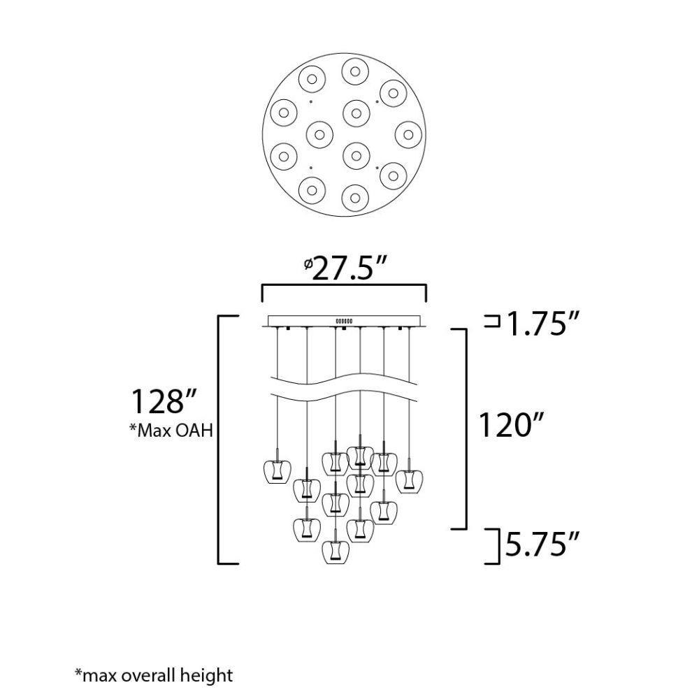 Clear apple shaped glass rest on machined aluminum fonts finished in Satin Brass with integrated LED for even Illumination without the glare. The large scale 25 light comes pre-arranged for ease of installation and is perfect for that tall ceiling application.