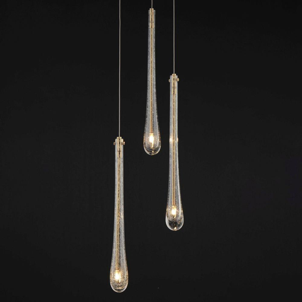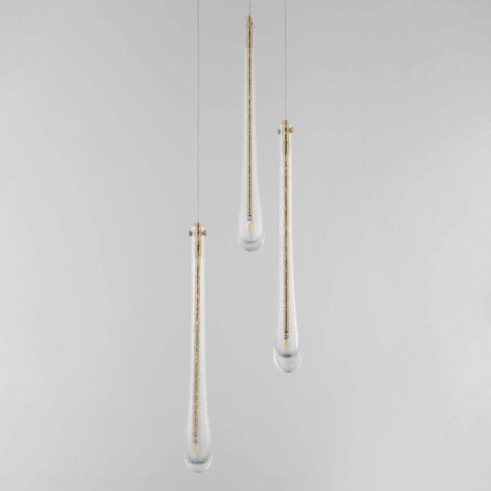 The classic teardrop glass shade is elevated in a luxurious collection of pendant configurations using substantially dense glass that are hand blown in elongated forms and curated into various color combinations. Suspended within the long, slender glass is a similarly long and slender socket to illuminate an energy efficient LED G4 lamp at the base of the glass. The slender tube running within the glass also supports the glass with elegantly flat thumb screws in coordinating finishes. Choose from Matte Black metal with Mirror Smoked glass for a moodier ambience, crystal Clear glass that accentuates the thickness of the glass walls paired with transitional Satin Nickel metalwork, or celebrate the design with effervescent Bubble glass and plated Gold metalwork.