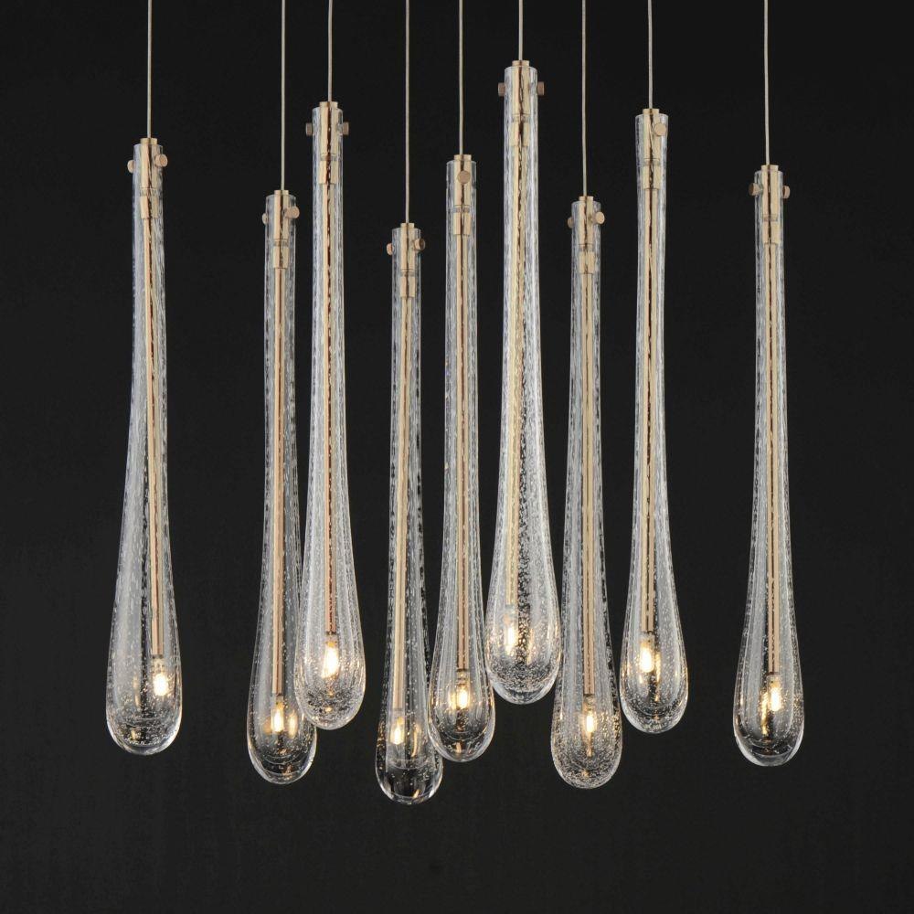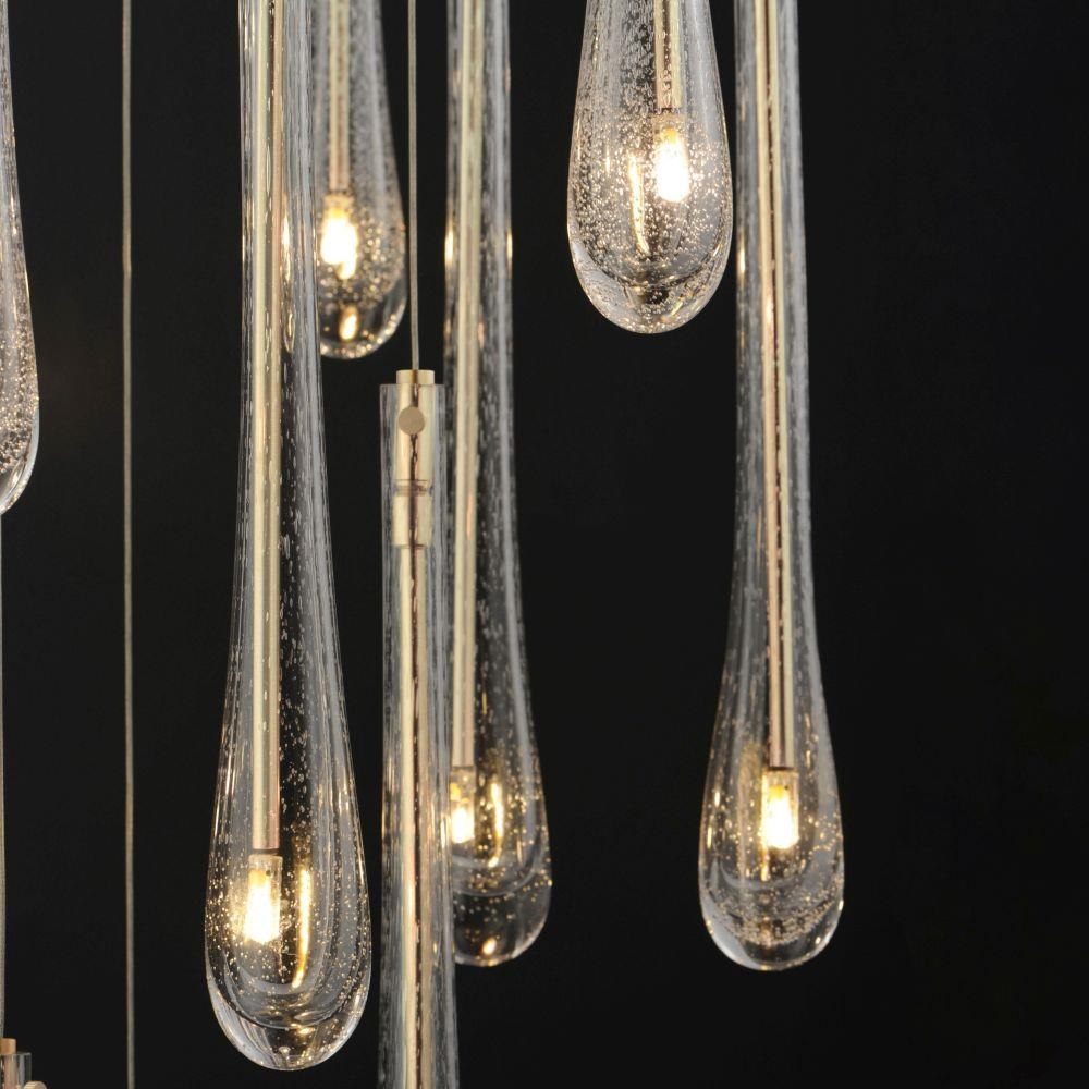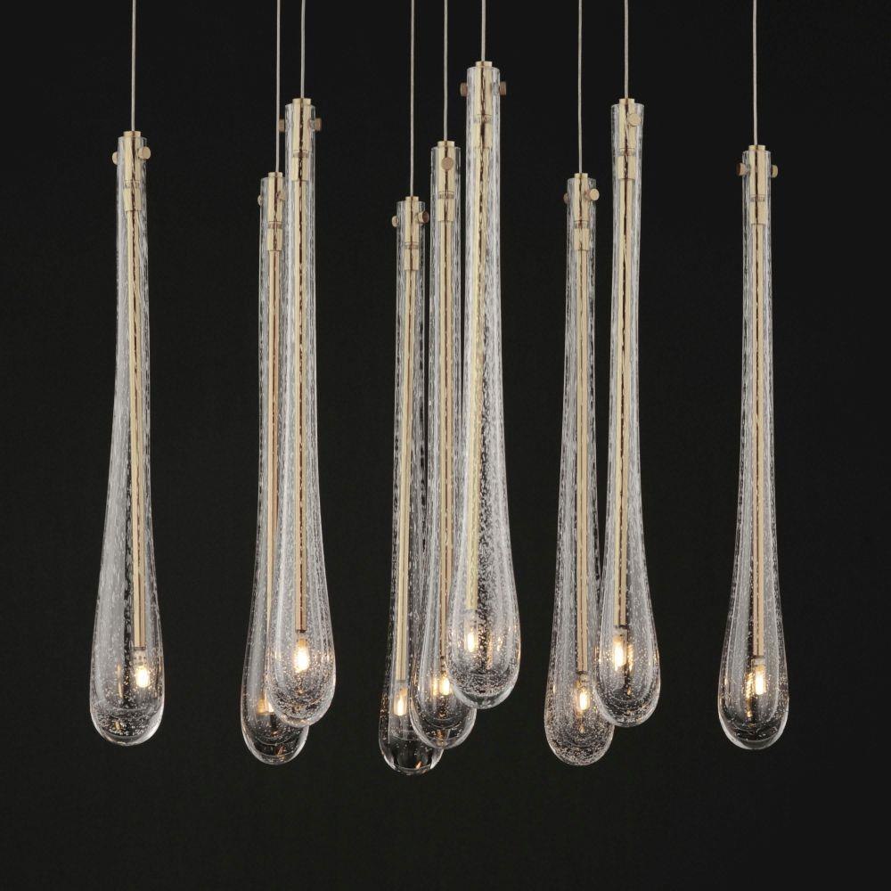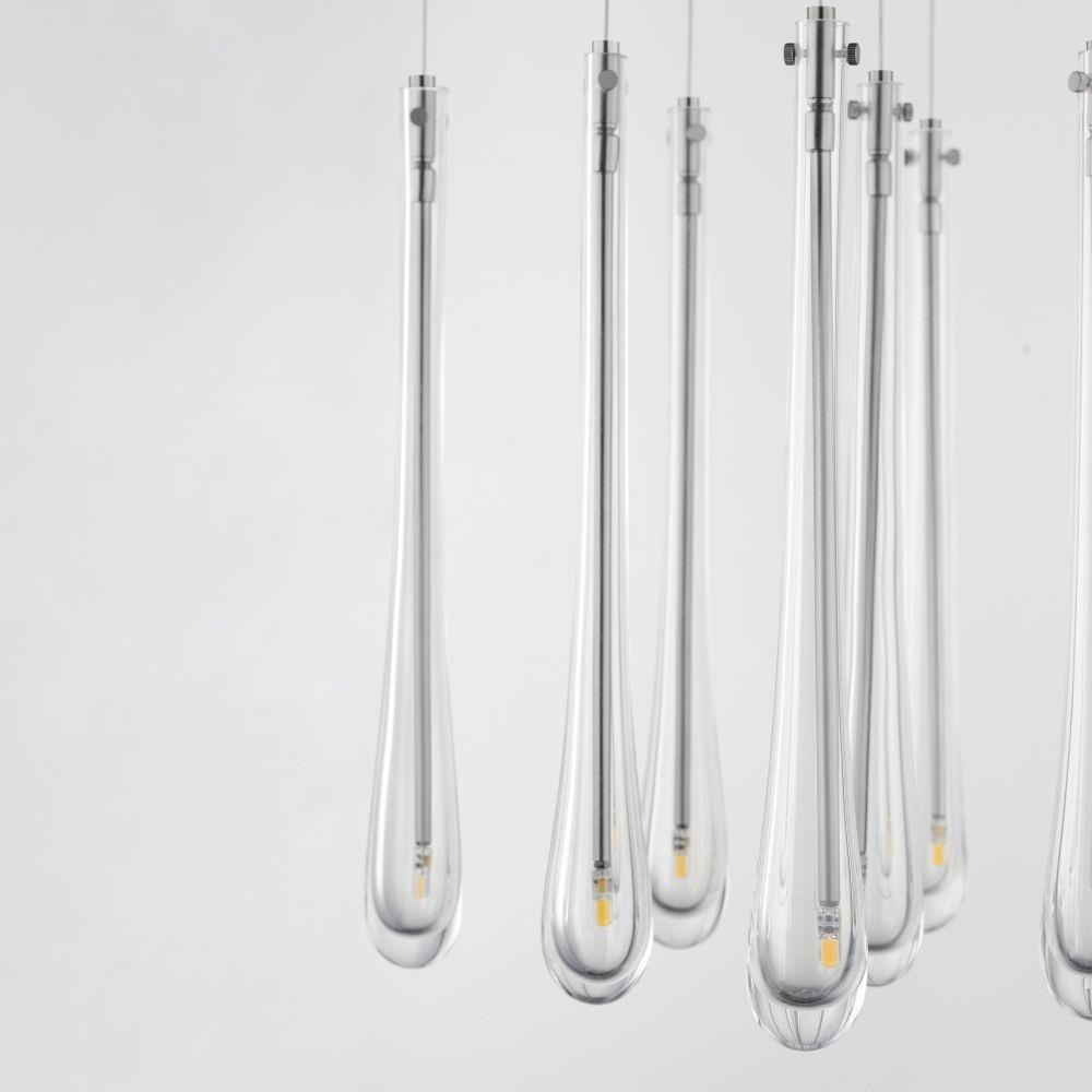 The classic teardrop glass shade is elevated in a luxurious collection of pendant configurations using substantially dense glass that are hand blown in elongated forms and curated into various color combinations. Suspended within the long, slender glass is a similarly long and slender socket to illuminate an energy efficient LED G4 lamp at the base of the glass. The slender tube running within the glass also supports the glass with elegantly flat thumb screws in coordinating finishes. Choose from Matte Black metal with Mirror Smoked glass for a moodier ambience, crystal Clear glass that accentuates the thickness of the glass walls paired with transitional Satin Nickel metalwork, or celebrate the design with effervescent Bubble glass and plated Gold metalwork.