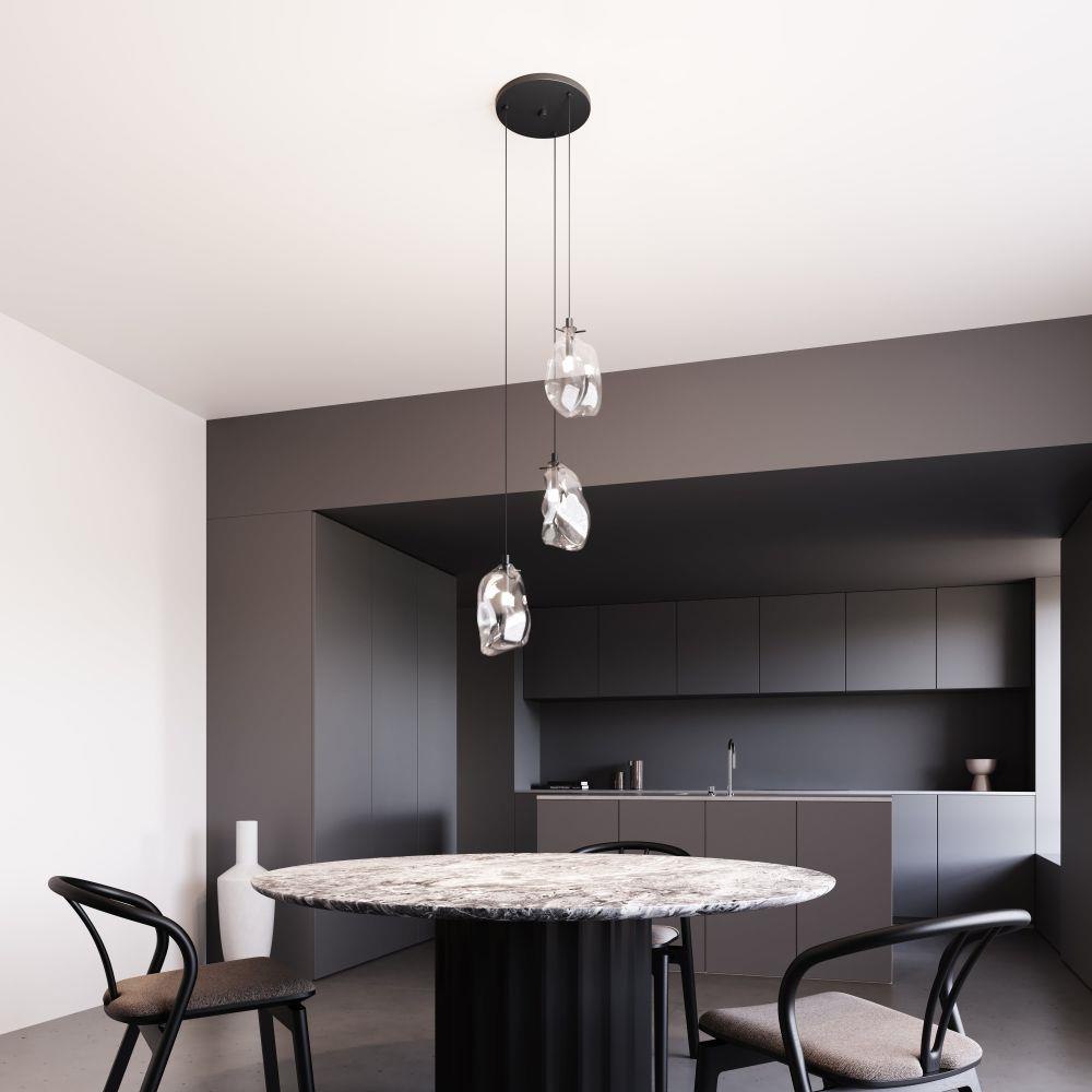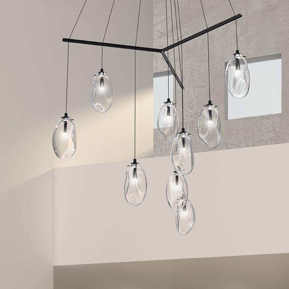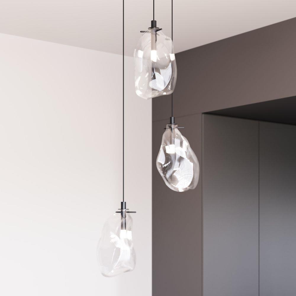Liquid Chandelier is available in clear, smoke fade, and poured white glass. They can be hung individually, in multiples, or with spreaders to form larger arrangements. Also available as a single pendant.