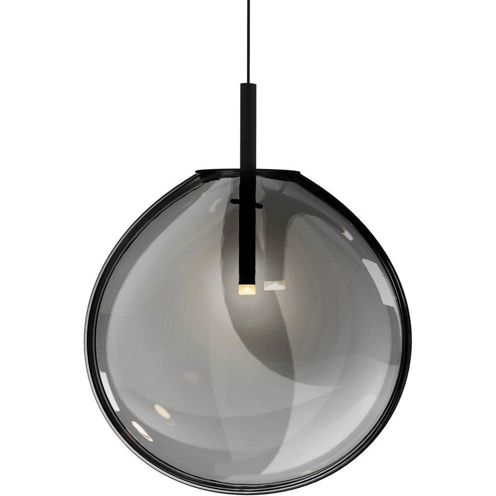 A flask-like flat oval glass profile, suspended from a slender cable, rotates randomly to various orientations creating an asymmetric relationship to its surroundings. A single point source of LED illumination within the void of the larger glass volume creates a special aesthetic tension of scales. Also available as a single pendant.