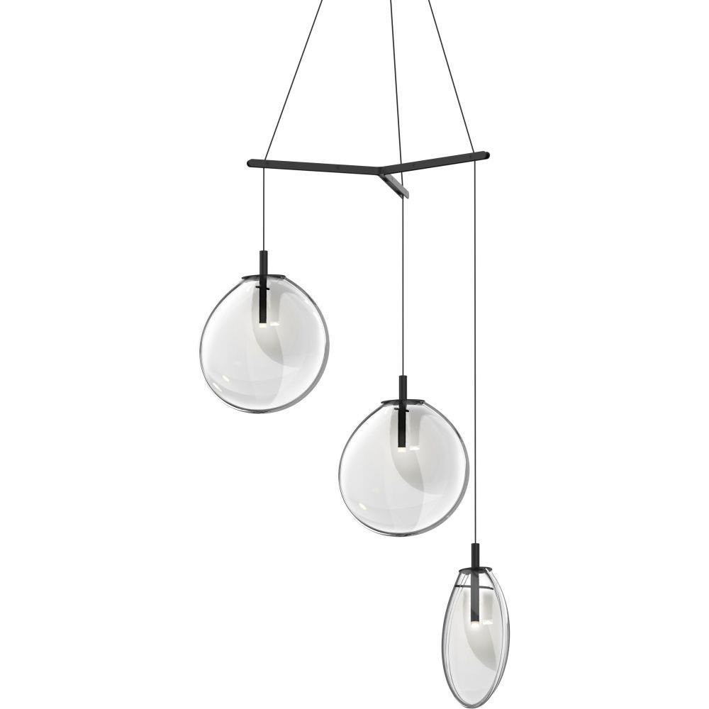 A flask-like flat oval glass profile, suspended from a slender cable, rotates randomly to various orientations creating an asymmetric relationship to its surroundings. A single point source of LED illumination within the void of the larger glass volume creates a special aesthetic tension of scales. Also available as a single pendant.
