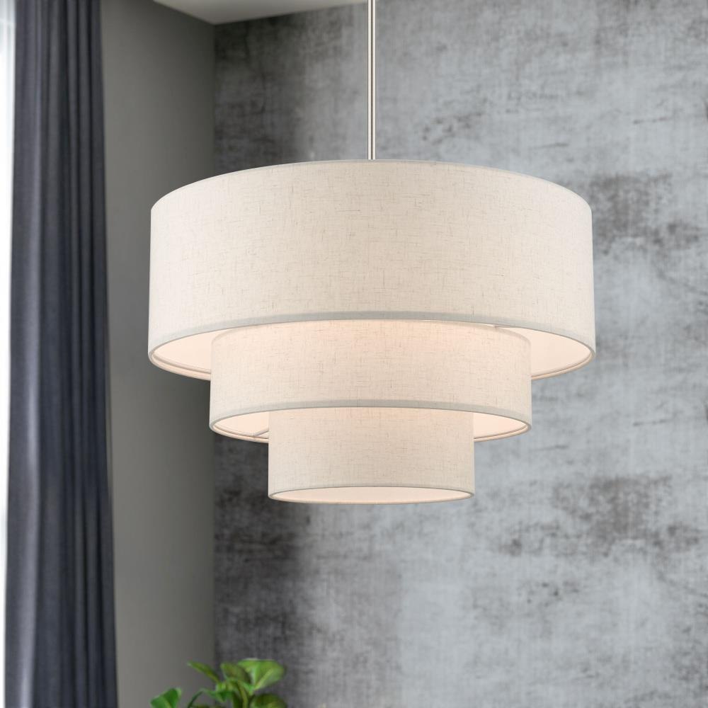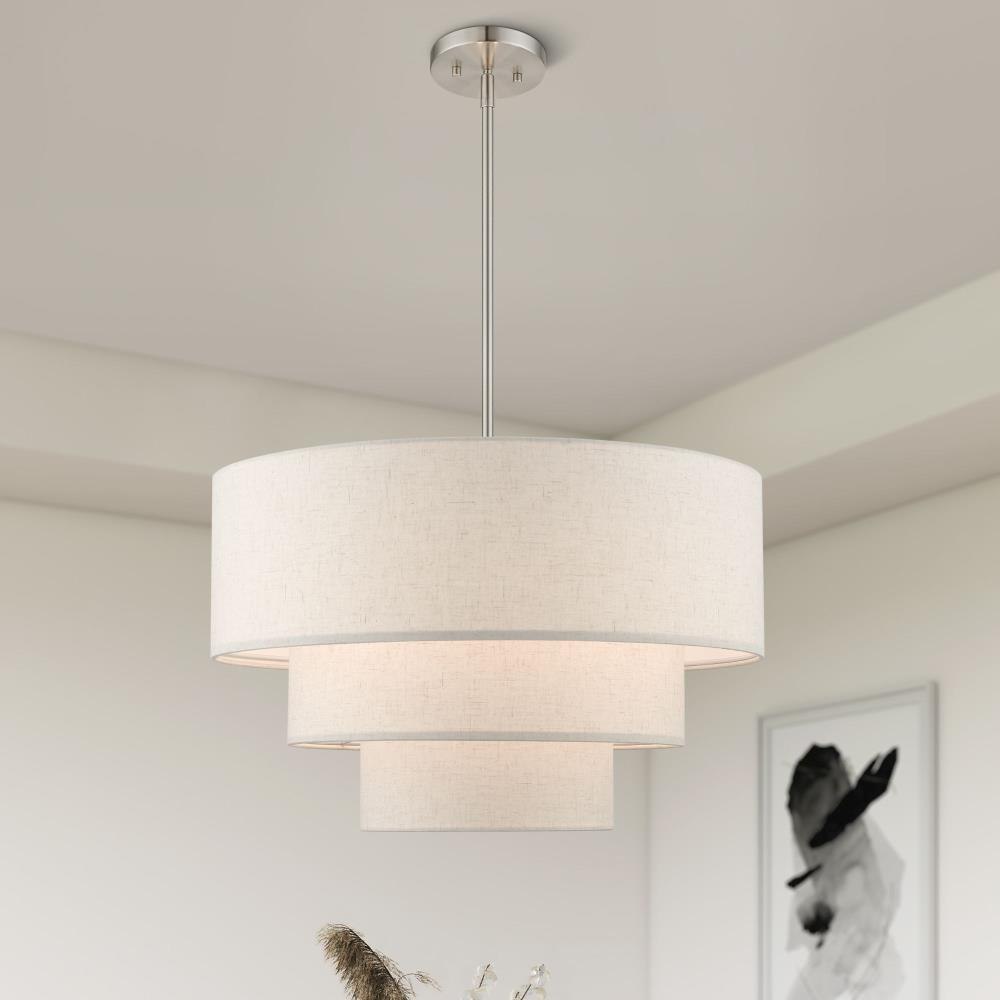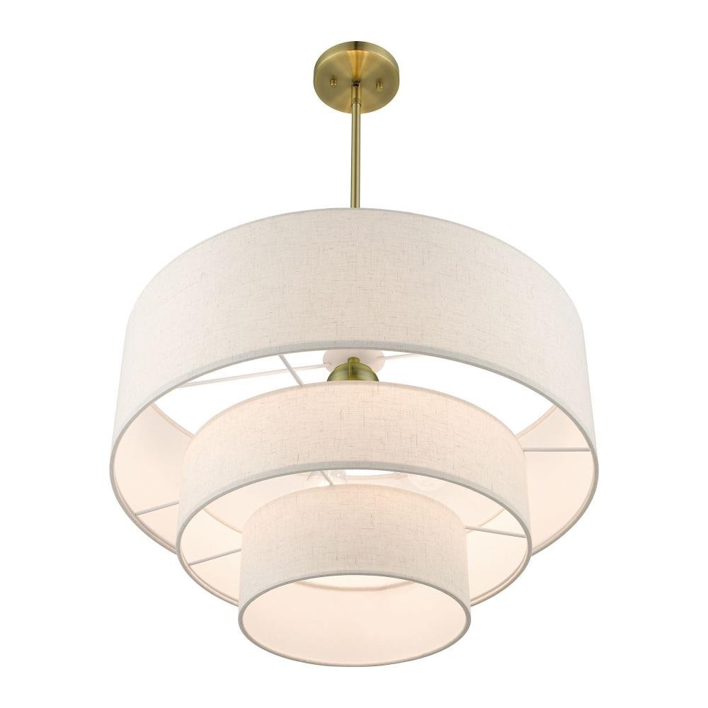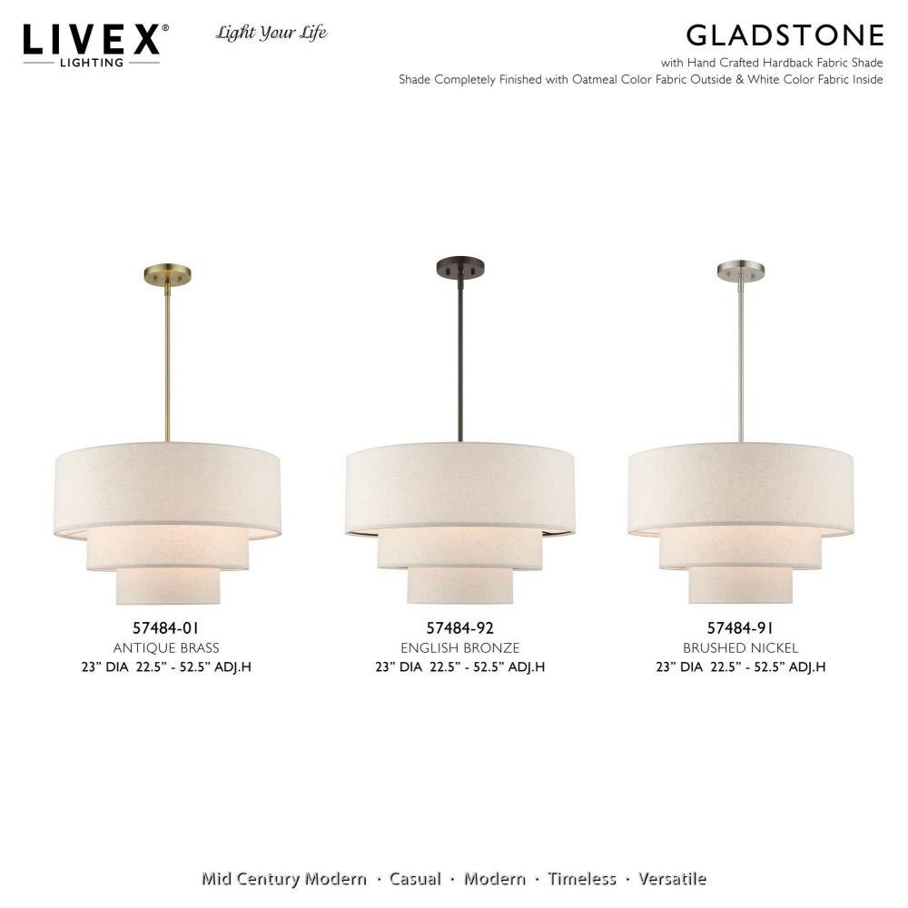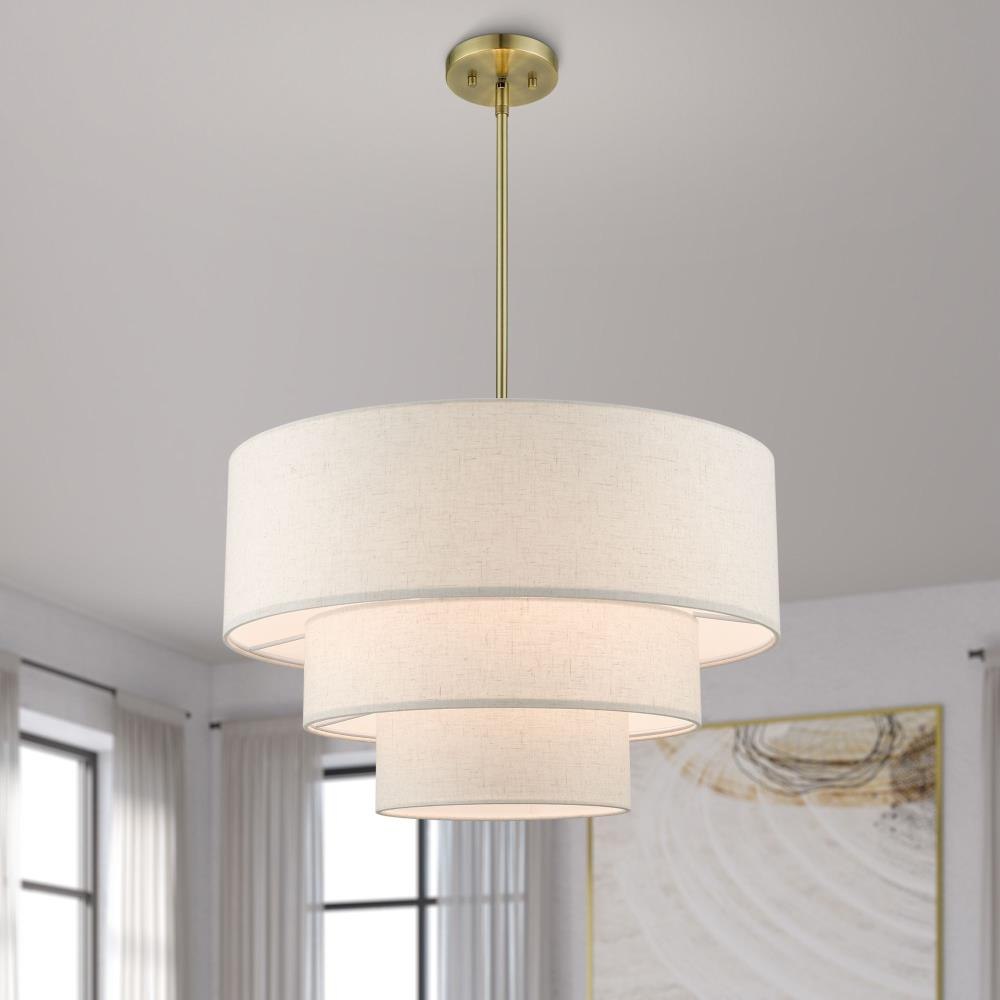 Enhance your interior ambiance with the Gladstone 4 Light Pendant, a refined lighting fixture designed in a Mid-Century Modern style. Measuring 22.5 inches in height and 23 inches in width, this pendant chandelier offers a balanced presence suitable for living rooms, dining areas, kitchens, and bedrooms. The hand-crafted oatmeal-colored fabric hardback shade is complemented by a silky white fabric lining on the interior, creating a soft, inviting illumination that sets a pleasant mood throughout the space. The fixture’s antique brass finish adds a timeless, elegant touch to its overall aesthetic.