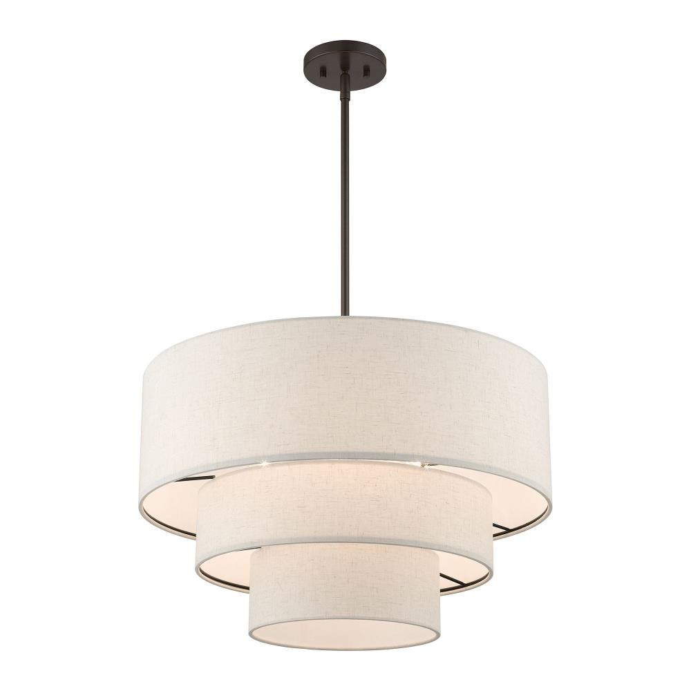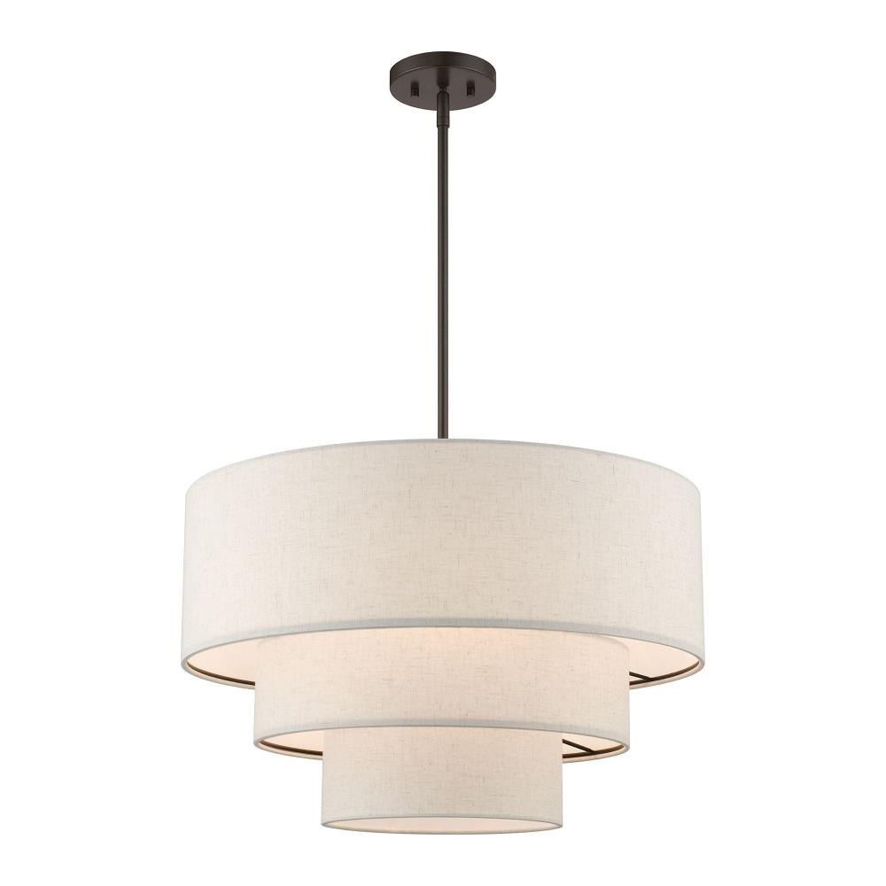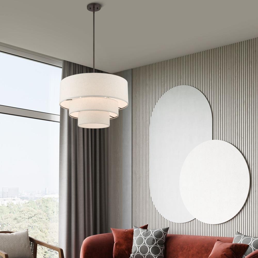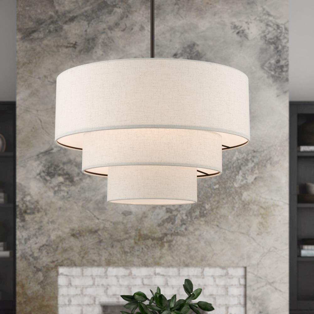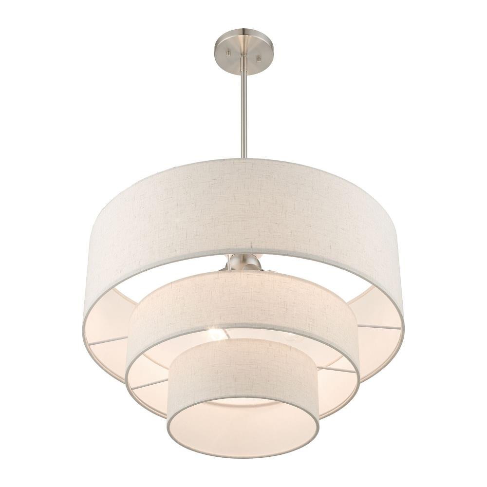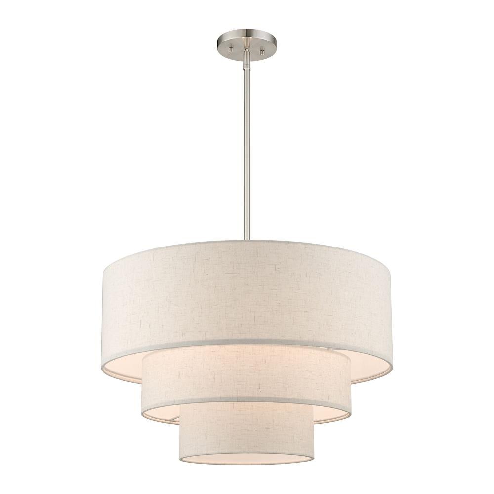 Enhance your interior ambiance with the Gladstone 4 Light Pendant, a refined lighting fixture designed in a Mid-Century Modern style. Measuring 22.5 inches in height and 23 inches in width, this pendant chandelier offers a balanced presence suitable for living rooms, dining areas, kitchens, and bedrooms. The hand-crafted oatmeal-colored fabric hardback shade is complemented by a silky white fabric lining on the interior, creating a soft, inviting illumination that sets a pleasant mood throughout the space. The fixture’s antique brass finish adds a timeless, elegant touch to its overall aesthetic.