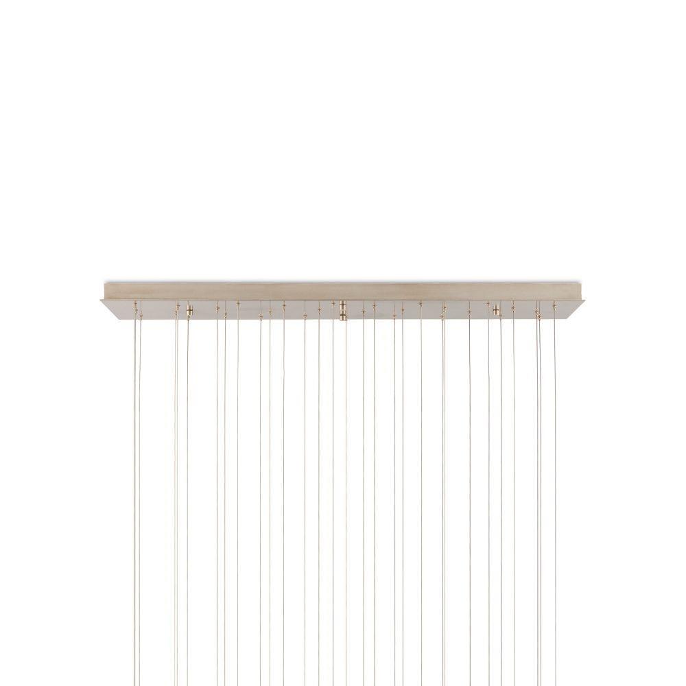 The Parish 30-Light Rectangular Multi-Drop Pendant has slender tear-drop-shaped shadesmade of white glass poured into a metal cage in an antique brass finish when it was still molten. A remarkable result of this process is that it creates tiny pinholes of light that escape through micro-bubbles that formed in the glass, making the Parish effervesce like an upside-down goblet of champagne.