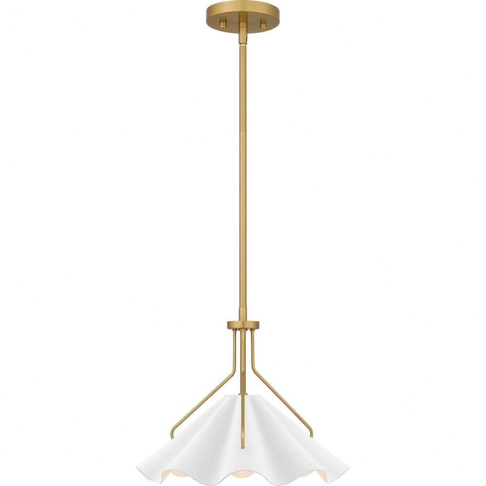 Combining a playful silhouette with modern styling, the Mejia pendant light offers a striking update to any space. The white metal shade featuring a unique swirling design adds drama, while an aged brass finish adds a gold shine. Hung individually or in a grouping, Mejia pendants make a fun and stylish statement in any setting.