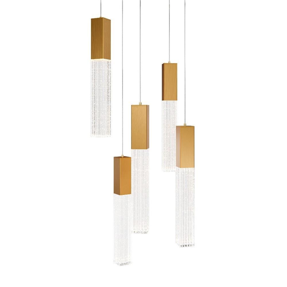 In a luxe finish, the Cinema round multi-light pendant makes a modern statement that's right in line with the latest trends. Painstakingly V-cut seeded crystal adds understated glamour when it fills with light sourced from high-performance LEDS offering color temperature adjustability. Available in an aged brass or black finish, you can select 3, 5, 9, 15 or 21 lights installed on a round canopy.