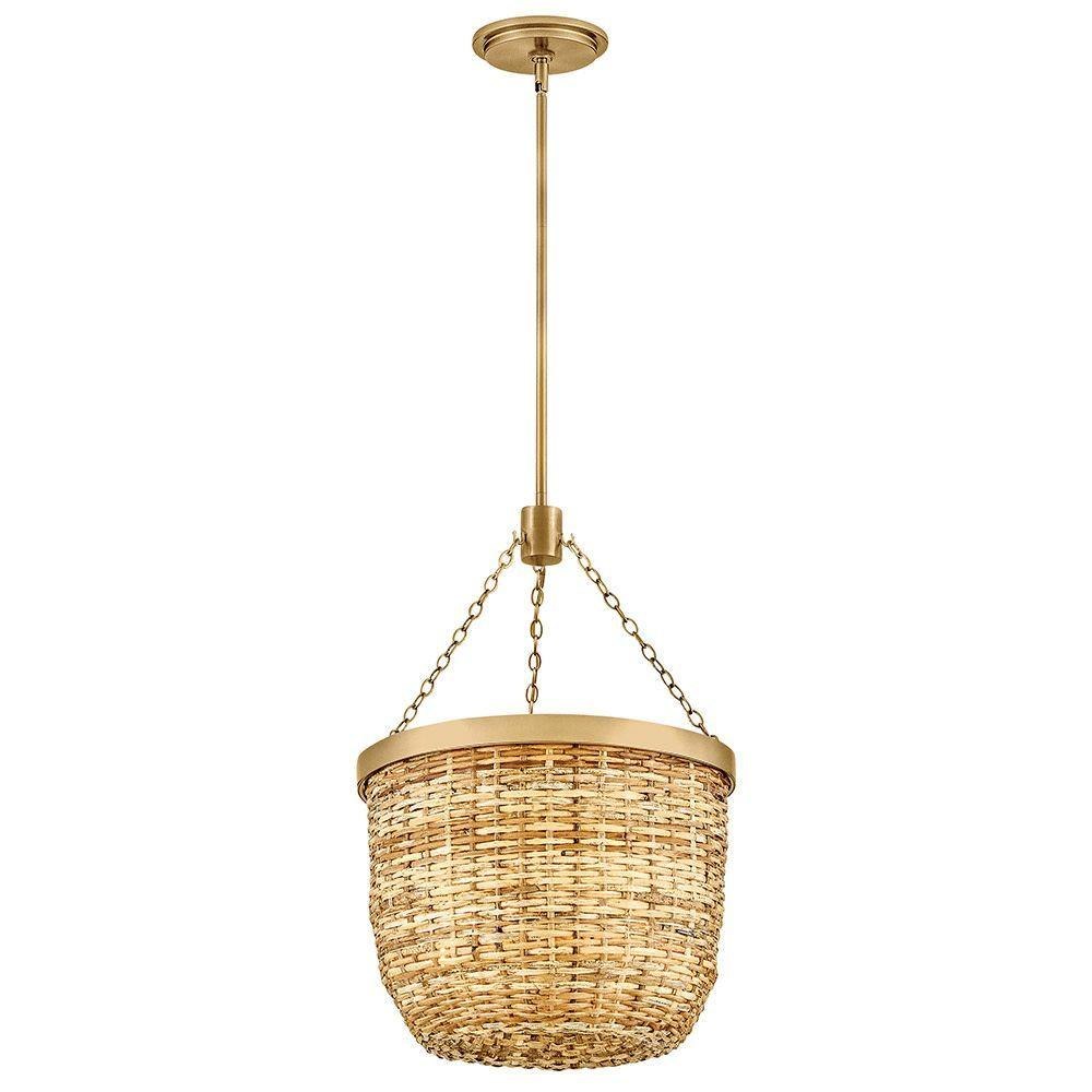 Polished details and inviting organic texture give Sanibel’s basket-woven natural paper shade incredible charm and elevated style. Chic metal trim and decorative chains accentuate the classic round silhouette, enhanced by a refined Lacquered Brass finish.