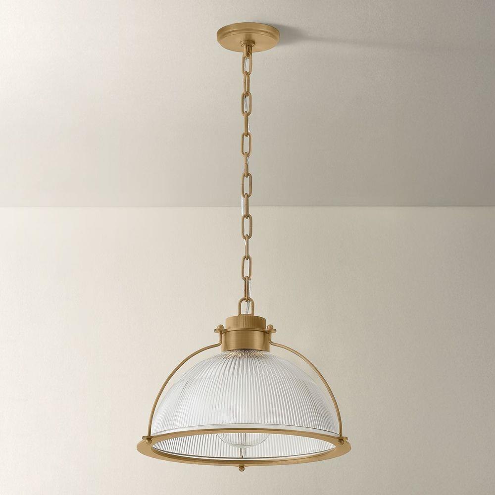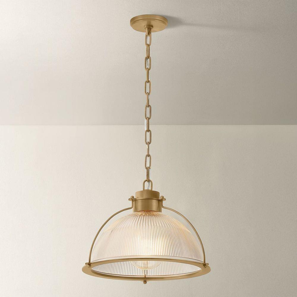 Inspired by classic RLM silhouettes, Glint reimagines industrial design with character and vintage-inspired details. The ribbed Holophane glass shade adds texture while softly diffusing light. Three suspension arms work to create a clean, structural frame that emphasizes balance and craftsmanship. A Patina Brass finish enhances Glint’s retro aesthetic.