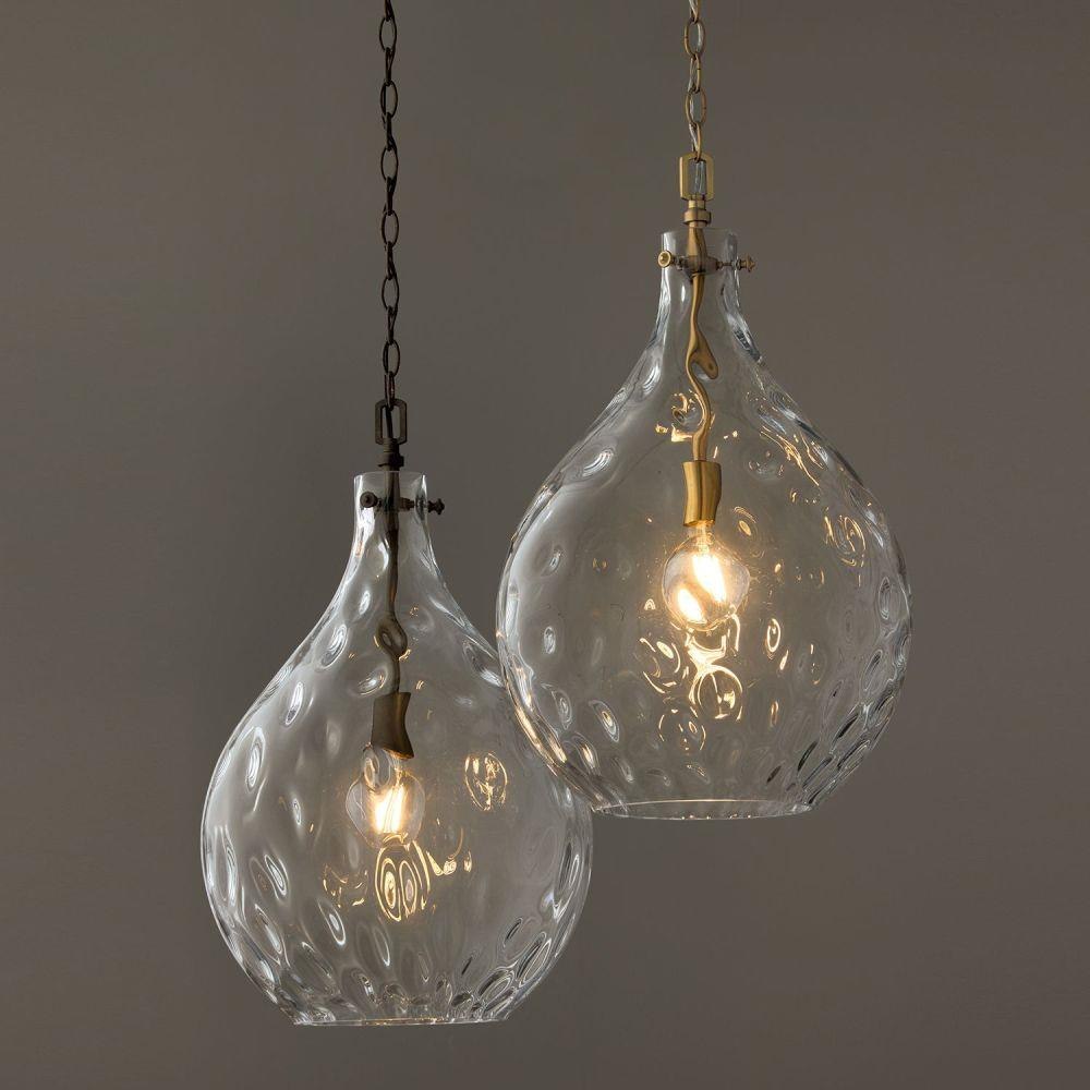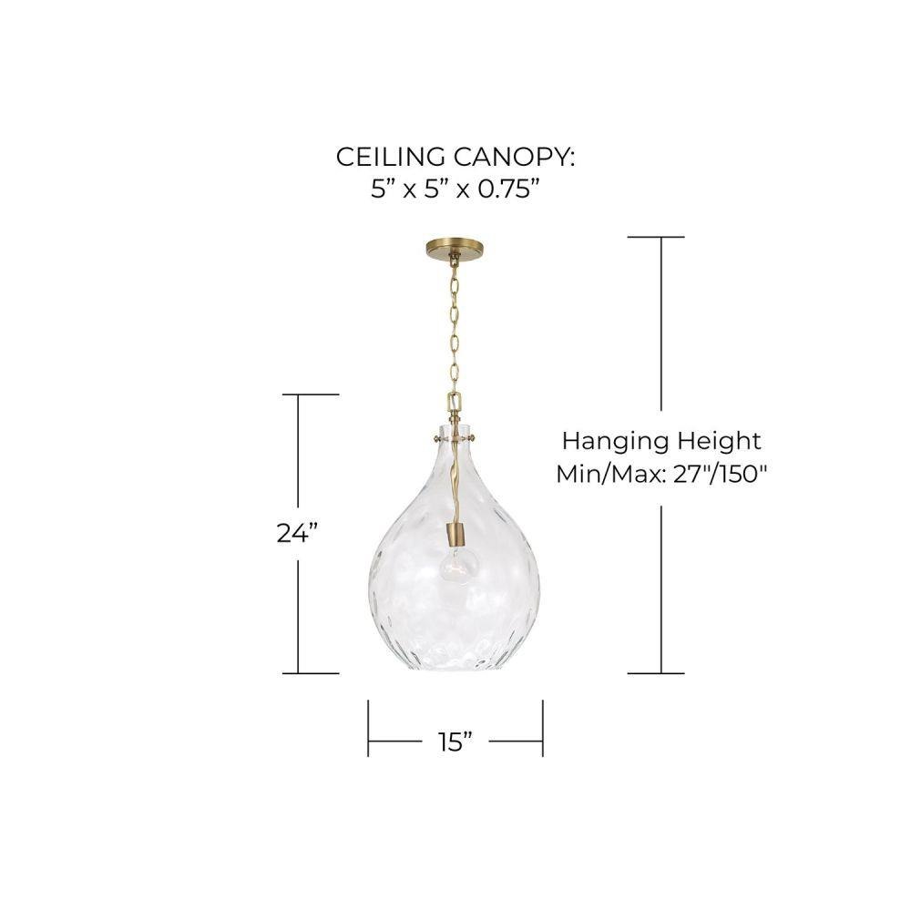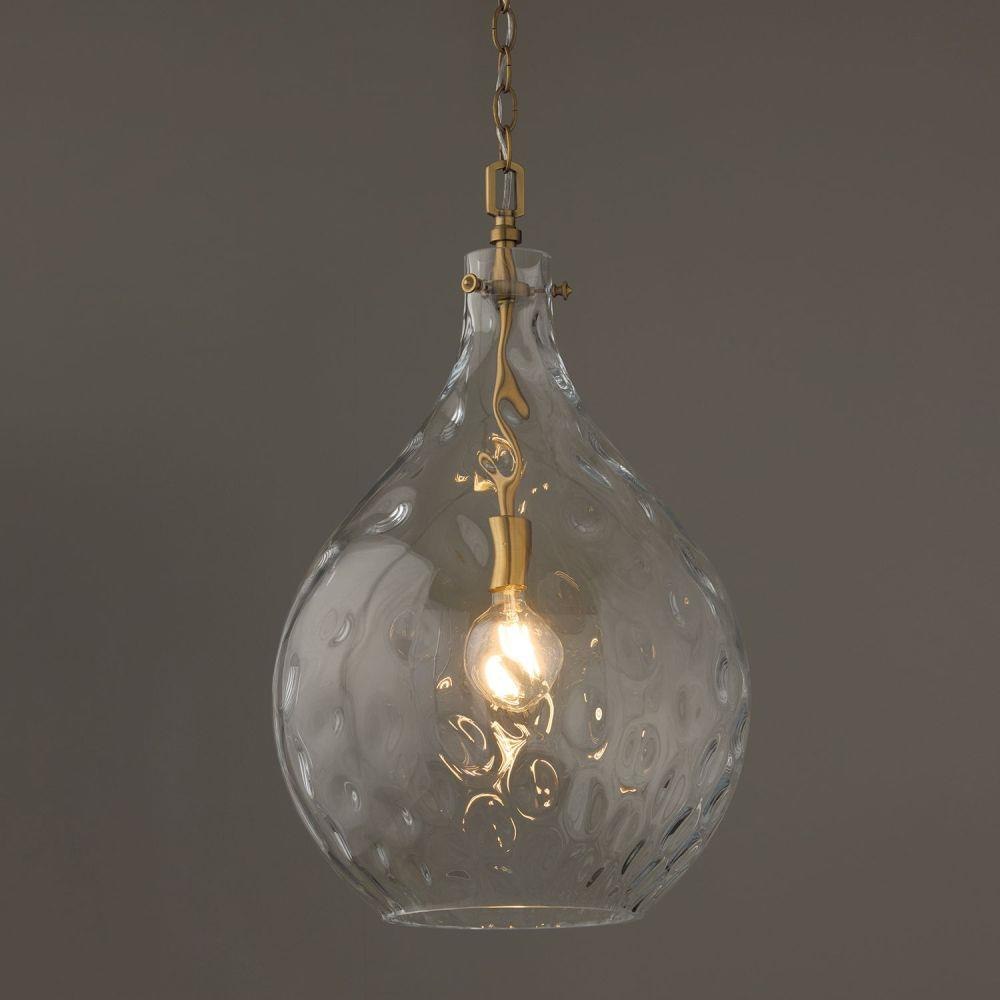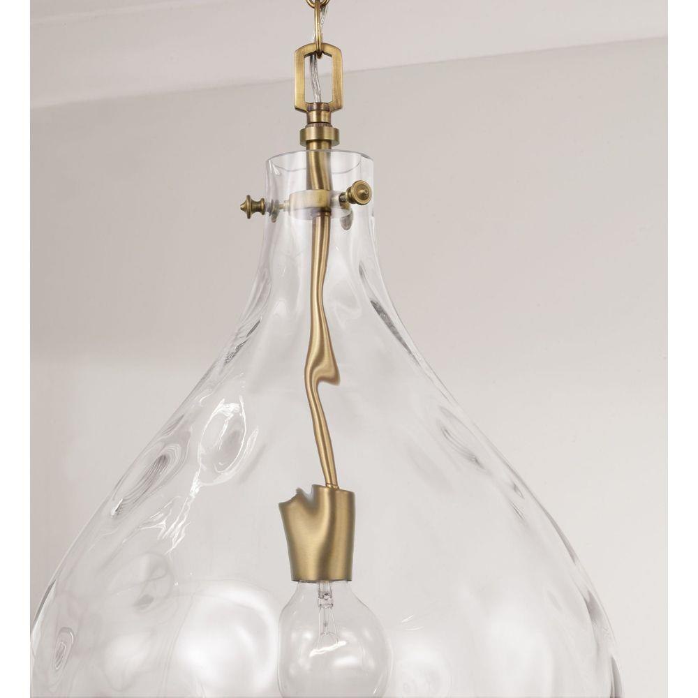 Defined by a signature, teardrop-shaped Clear Water glass shade, the Bristol Pendant brings high design without overpowering a space. The Aged Brass adds a classic finish to this compelling luminaire.