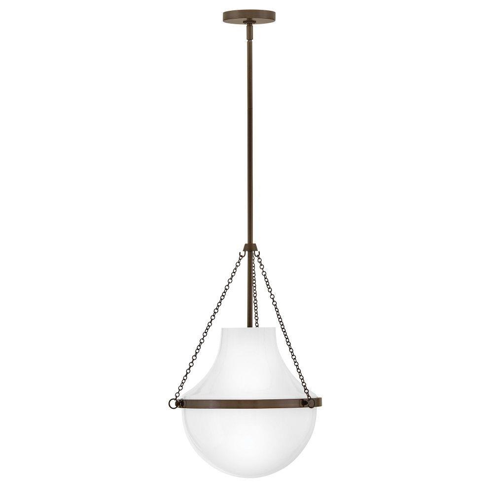 Fusing a sculpted, modern form with classically styled details, Collins features a transitional teardrop shade crafted from blown, Cased Opal glass. A central metal band and delicate chain uprights are available in Black Oxide, Heritage Brass, Heritage Bronze, or Polished Nickel finishes.