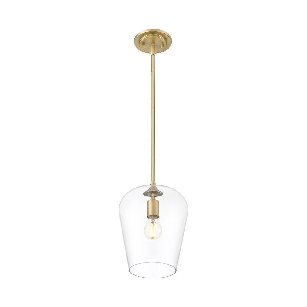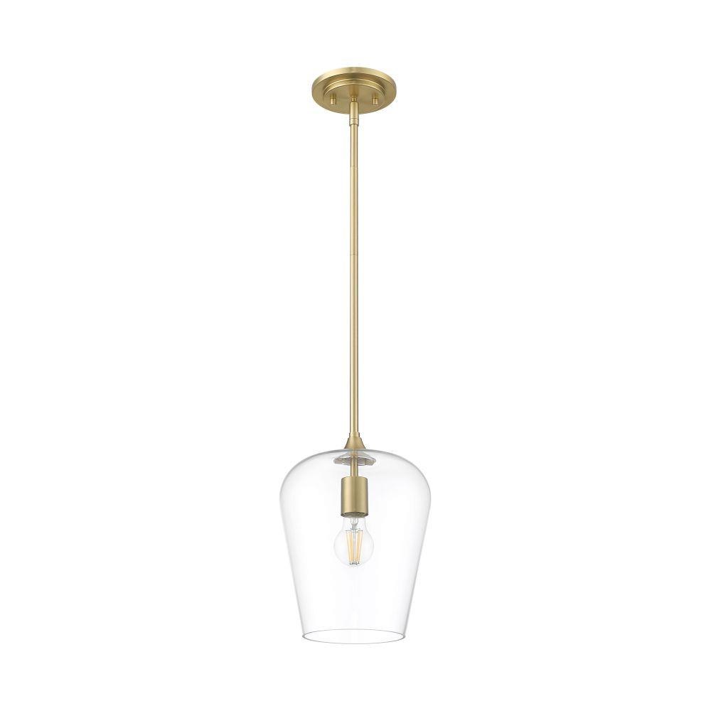 Soft artistry reflects in this single-light fixture blending metal and glass and offering a tasteful and timeless motif. Beautiful burnished brass finish steel framing and an inverted clear glass shade create simple silhouette with tons of elegance and versatility, as dimming features add important customization of high-level or low-level lighting.