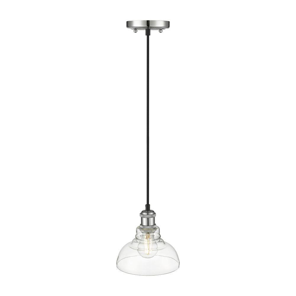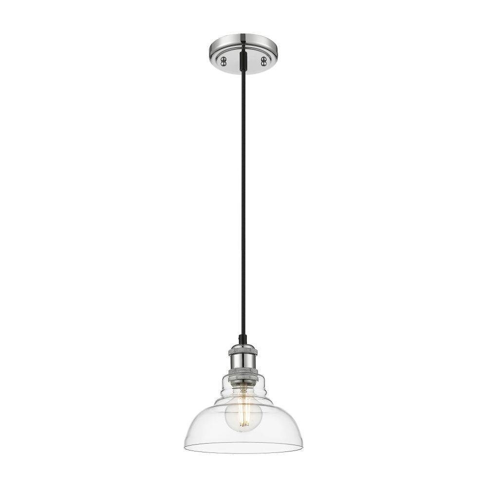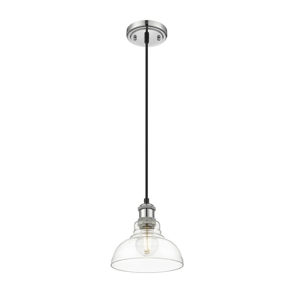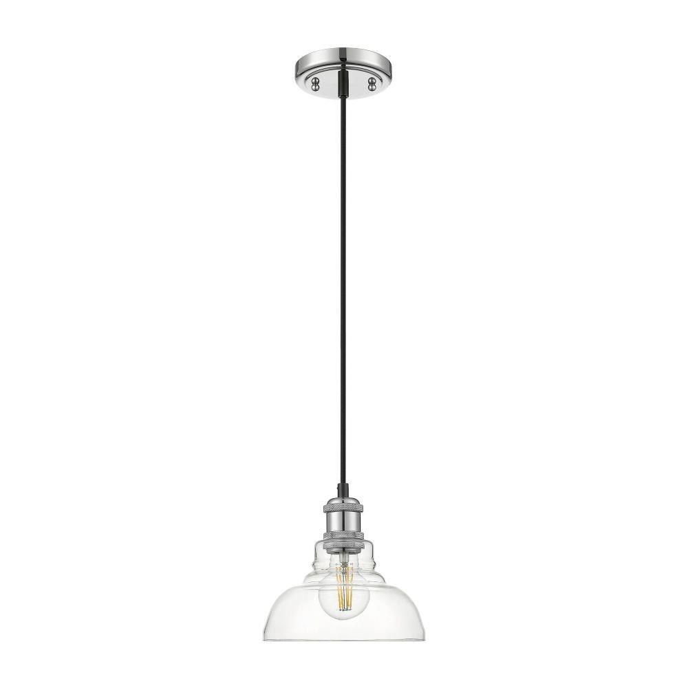 Bring transitional sophistication into your home with the Yep by Golden Lighting Carver 1-light Pendant in Chrome. Featuring a clear glass shade and a polished chrome frame, it creates an inviting atmosphere.The clear glass shade offers brilliant, unobstructed light with its glossy surface, allowing the beauty of the bulb to shine through and brighten any space. Its elegant design fits seamlessly into various decor styles, from modern to classic.The polished chrome finish adds a stunning high-shine that refines your space, complementing its surrounding beautifully.This versatile pendant light is ideal for kitchens, dining rooms, and bathrooms, and is damp location rated for use in covered areas with occasional moisture. Installation is straightforward with sloped ceiling compatibility and an adjustable height, from 10" to 127".Dimensions measure 7.5"W x 7.13"H x 7.5"D, requiring one E26 Medium base bulb (not included), with a maximum wattage of 60 watts.Enhance your home with this perfect blend of style and quality craftsmanship.