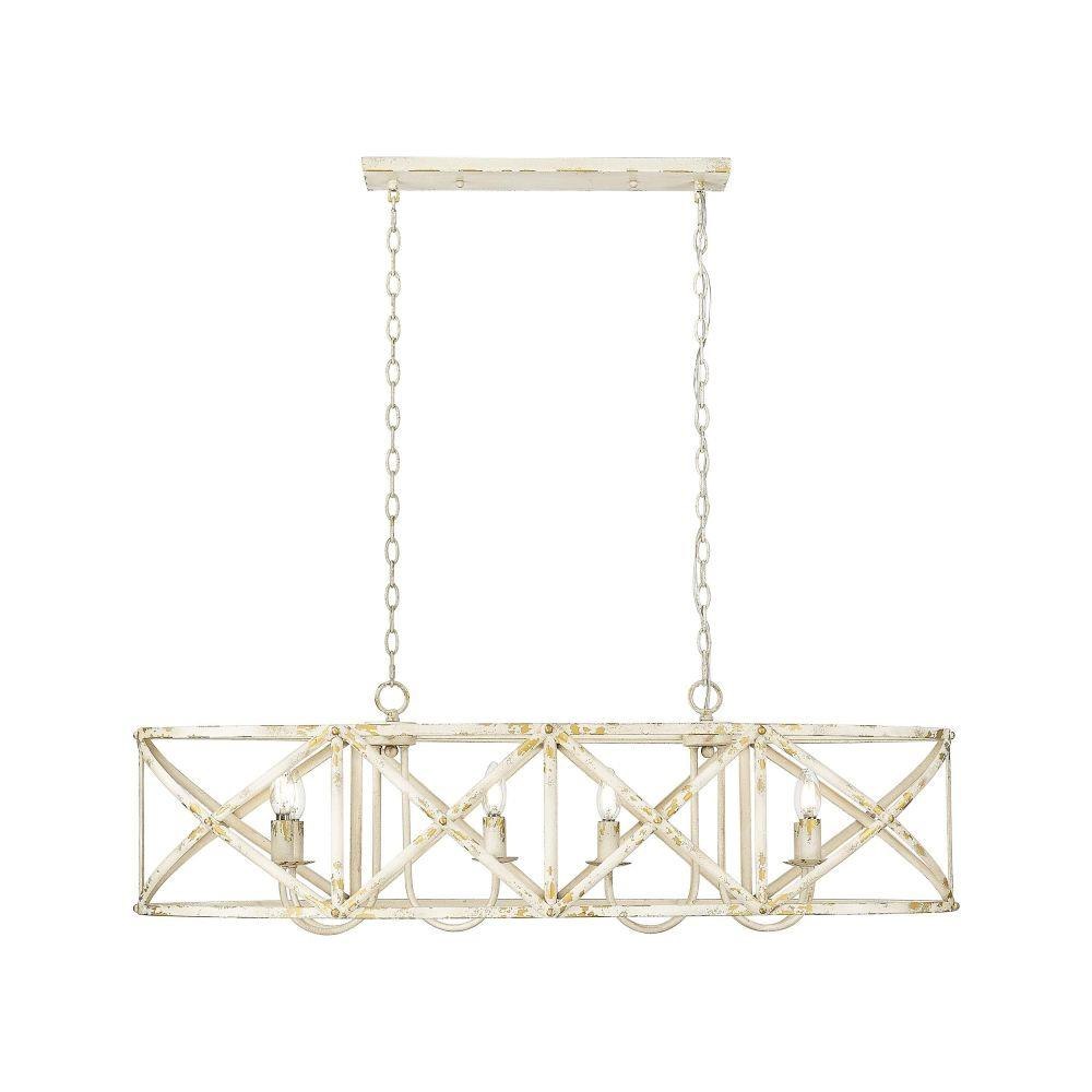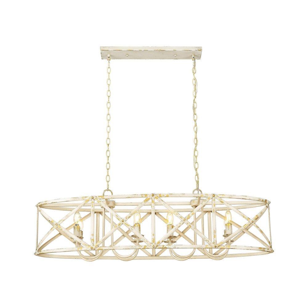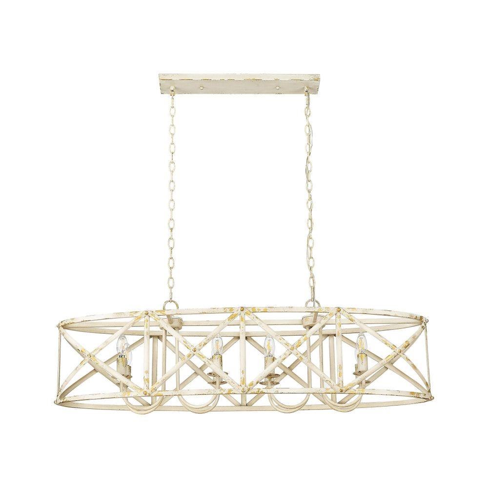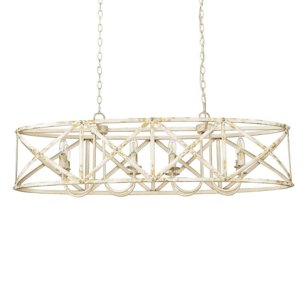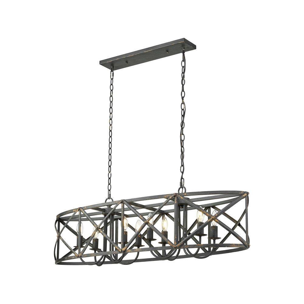 Bring traditional elegance into your home with the Golden Lighting Alcott 8-light Island Light. With a striking Antique Black Iron finish, it creates a welcoming and sophisticated atmosphere.Crafted with an open-cage design that allows light to radiate beautifully, this fixture showcases its artisanal nature, embodying vintage charm ideal for modern spaces. The finish tells a story of heritage, bringing character that's perfect for kitchen islands or dining areas.Each piece is hand-painted and showcases subtle variations, celebrating craftsmanship in a way that mass-produced fixtures cannot. Perfect for stylish gatherings or family meals, illuminating the area with grace.Dry Location Rated: Ideal for indoor spaces not subject to moisture. Sloped-Ceiling Compatible and Adjustable Height: Customize the hanging length from a minimum of 16.63" to a maximum of 90.25". Requires 8 E12 Candelabra base bulbs (not included), with a maximum wattage of 60 per bulb. Overall Dimensions: 45"W x 13.63"H x 14"D. Elevate your kitchen with this stunning piece that blends utility and aesthetic effortlessly.