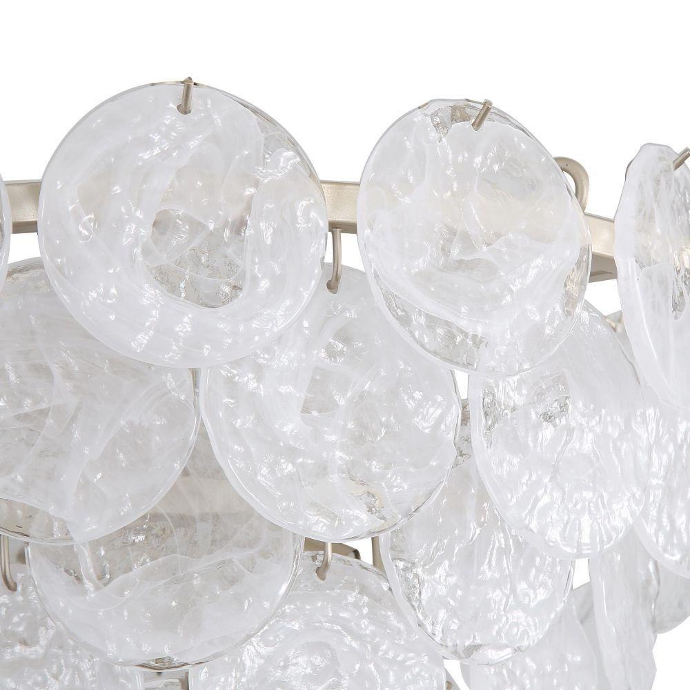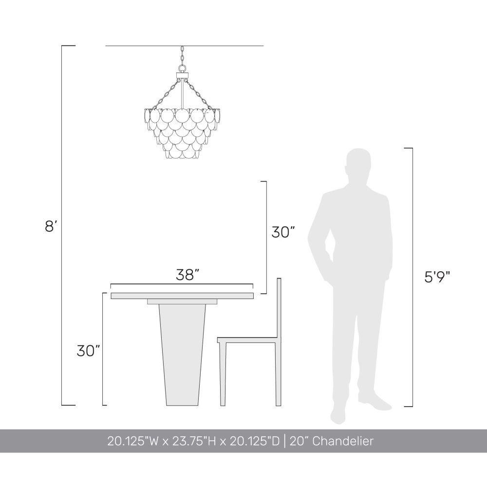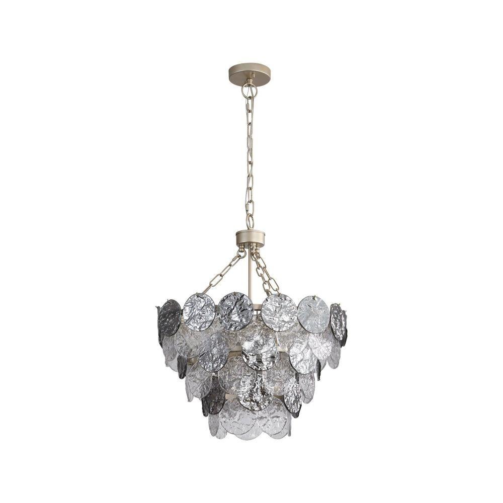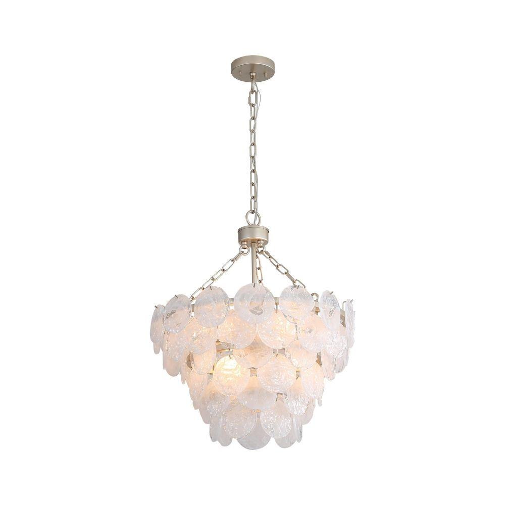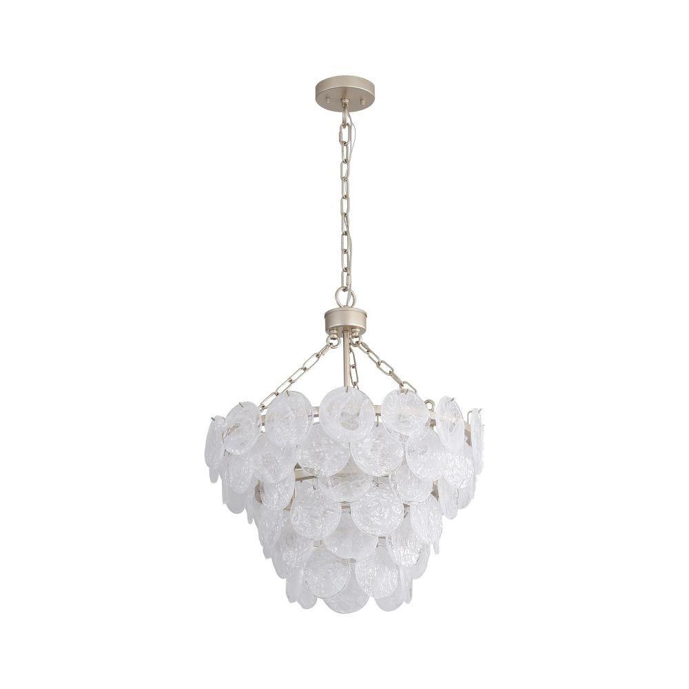 Bring coastal elegance into your home with the Yep by Golden Lighting Cascada 8-light Pendant in Aegean Silver and Cirrus Cloud Glass. Featuring a glass shade, this stunning piece creates a welcoming atmosphere.Each glass shade is an artisanal masterpiece, showcasing a clear base infused with wispy white swirls, and a hammered texture that beautifully catches the light, resulting in a dazzling visual display. The Aegean Silver finish, inspired by artisanal metalwork, adds a sophisticated texture with a soft satin lustre. This refined silver tone is both timeless and versatile, making it an ideal choice for various décor styles.Perfect for kitchens, dining rooms, and doorways, this pendant is dry location rated, making it ideal for indoor spaces. The installation is easy, with sloped-ceiling compatibility and adjustable heights ranging from 27.5" to 101.5".Overall Dimensions: 20.13"W x 23.75"H x 20.13"D. Requires 8 E12 Candelabra base bulbs (not included), max 60 watts per bulb.Elevate your home with this exquisite fixture that embodies quality and style.