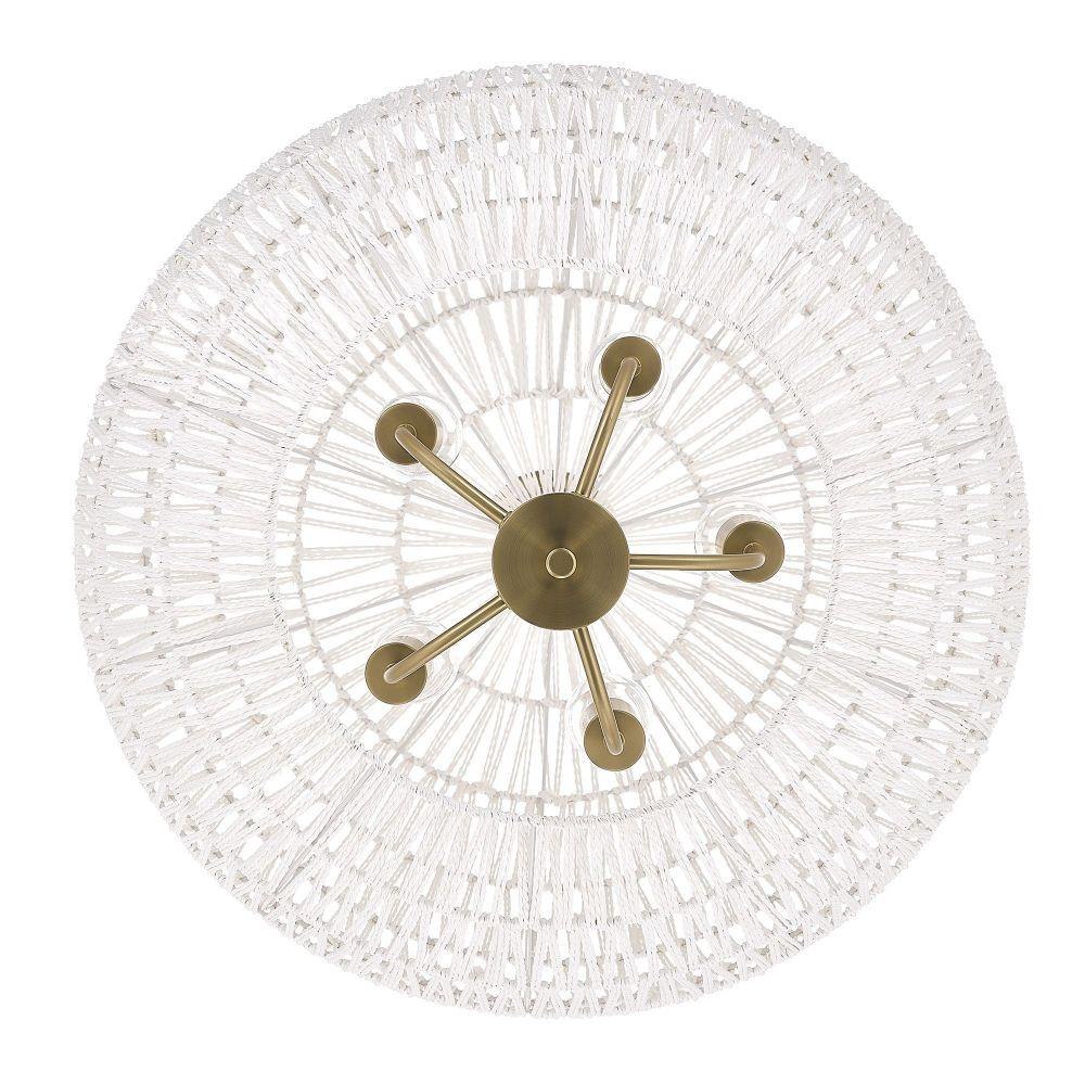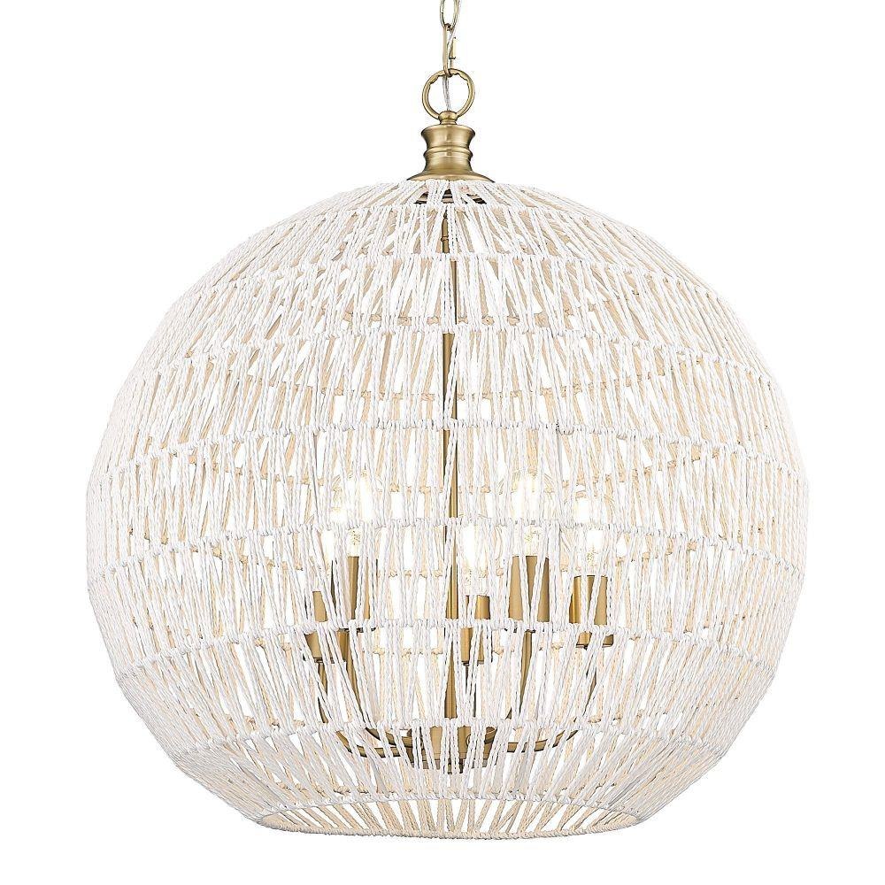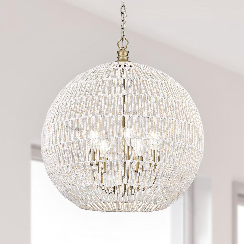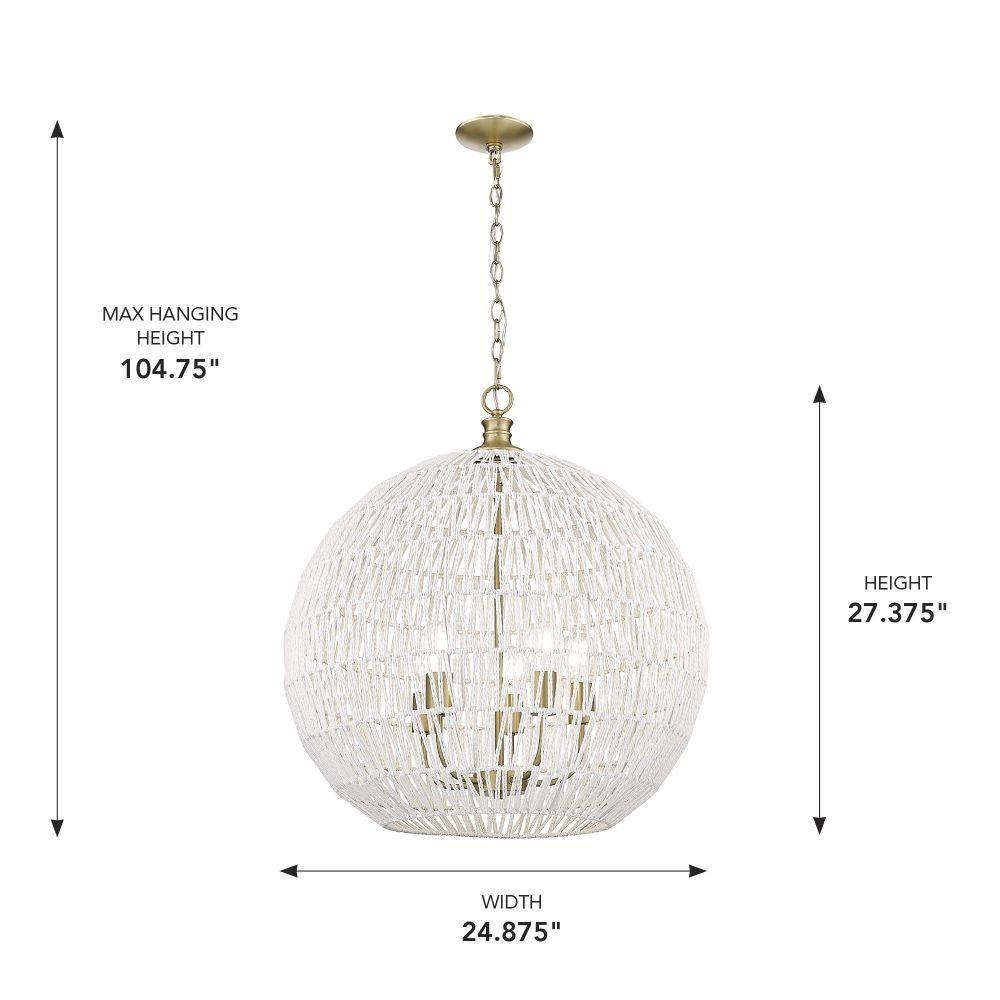 Bring nature-inspired elegance into your home with the Golden Lighting Florence 5-light Pendant. Featuring a Rope shade and a Brushed Champagne Brass frame, it creates a welcoming atmosphere.The natural Rope shade adds a breezy, coastal vibe, crafted from Bleached White Raphia Rope, which provides a highly textural appearance, integrating light beautifully into your space. The Brushed Champagne Brass finish offers an understated, elegant alternative to traditional gold, enhancing your decor with a touch of quiet luxury and contemporary style. Ideal for kitchens, dining rooms, or bedrooms—perfect for focused yet decorative illumination in entryways, foyers, or even bathrooms. Dry Location Rated, it’s suitable for indoor spaces not subject to moisture. Installation is made easy with its sloped-ceiling compatibility and adjustable height options (Min: 31.38"- Max: 104.75"). Overall Dimensions: 24.88"W x 27.38"H x 24.88"D, Requires 5 E26 Medium base bulbs (not included, Max 60 watt per bulb).Transform your living space with this stunning pendant, exuding quality and charm, perfect for any bohemian-inspired interior.