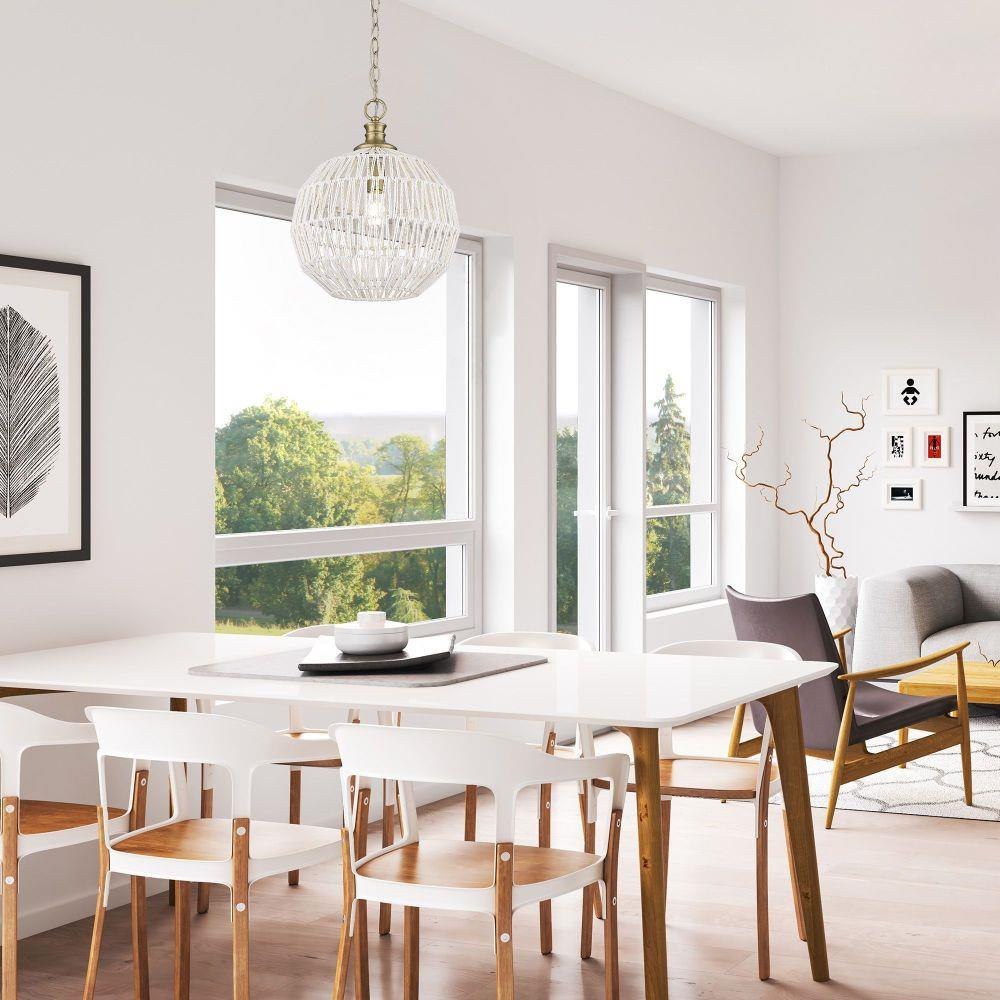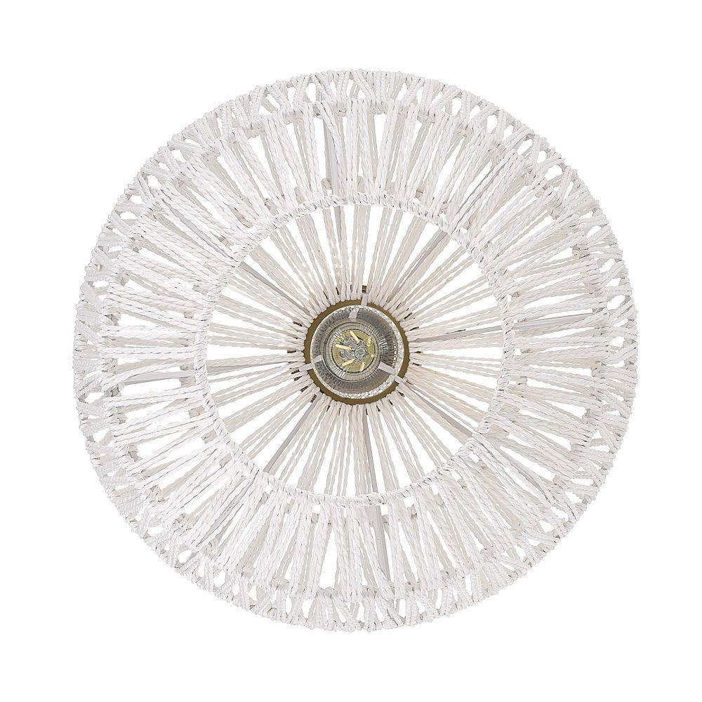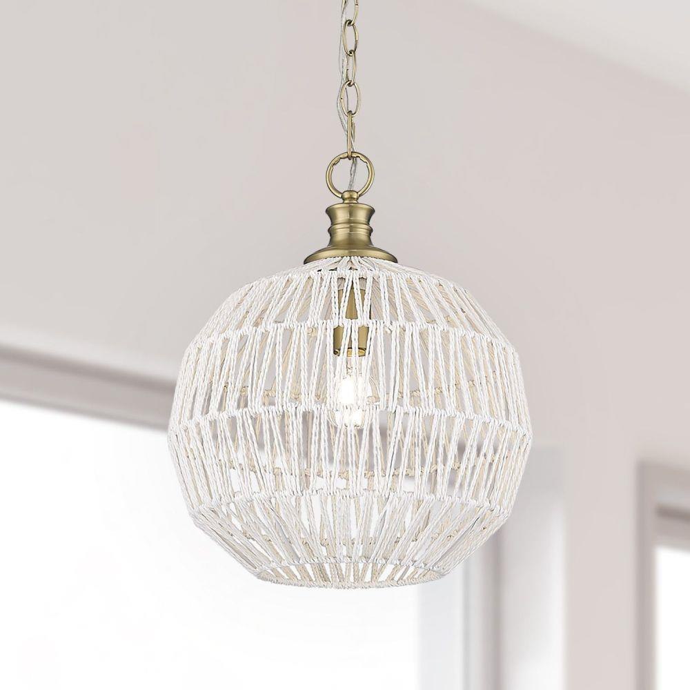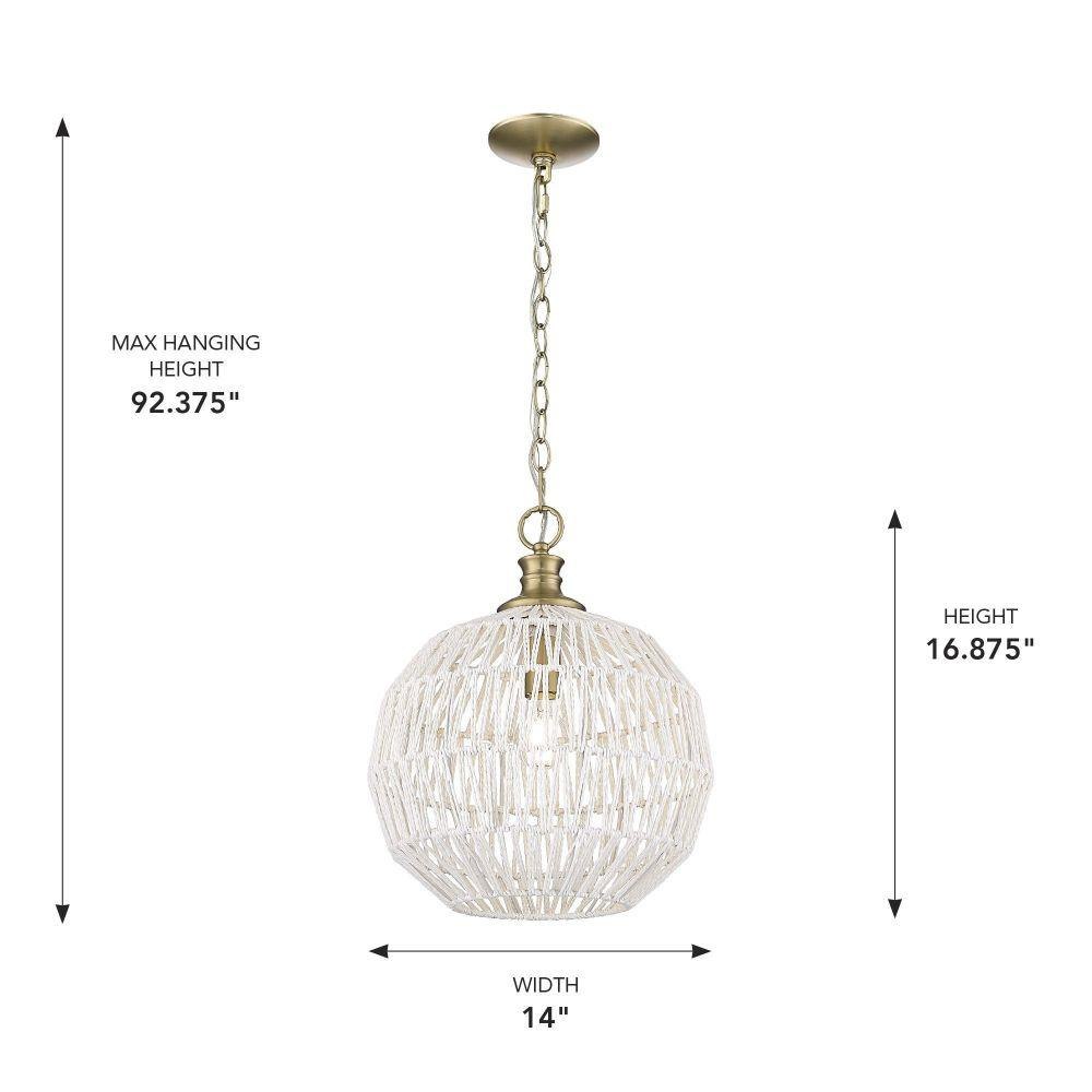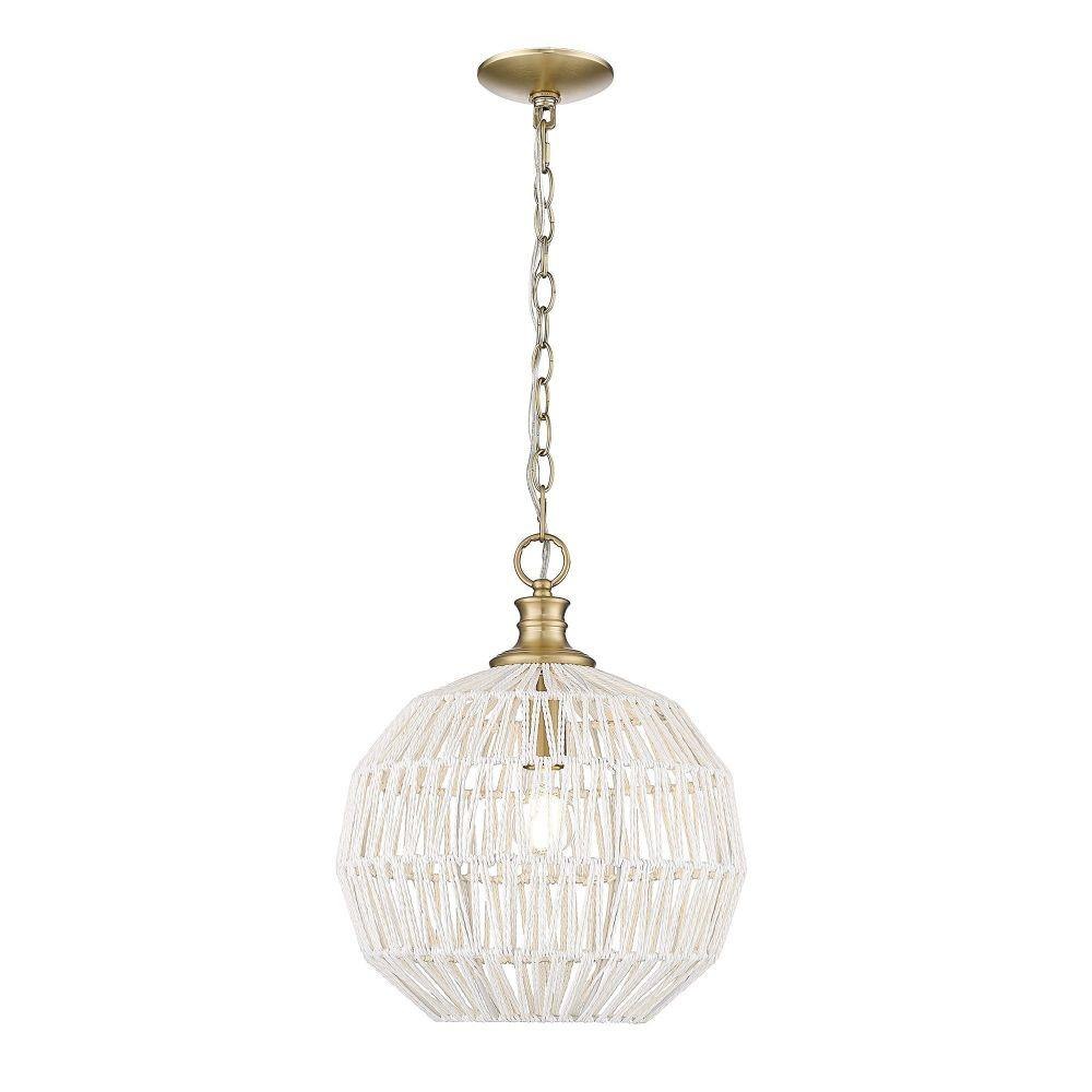 Bring boho elegance into your home with the Golden Lighting Florence 1-light Pendant. Featuring a Rope shade and a Brushed Champagne Brass frame, it creates a welcoming atmosphere. The Rope shade, made from Bleached White Raphia, offers a clean, bright, and textural appearance that brings a breezy, coastal vibe to any design. The epitome of modern sophistication, the Brushed Champagne Brass finish presents an understated elegance, making it a perfect choice for contemporary spaces. This pendant light is damp location rated, suitable for covered areas with occasional moisture, and is easily adjustable in height, making installation on angled ceilings a breeze. Dimensions of this fixture are 14"W x 16.88"H x 14"D, requiring one E26 Medium base bulb (not included) with a maximum wattage of 100. Experience quality and style with this artisanal lighting piece.