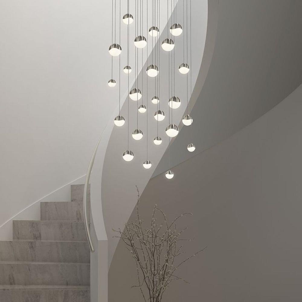 Grapes are luminous LED spheres in multiple sizes, arrayed in precise or random patterns, in clusters, or as single points of light. Seen from the middle or above, the crystal appears clear with a subtle luminance. Moving below, the crystal facets become increasingly apparent, refracting the light into a dazzling radiance. Also available in a single pendant.