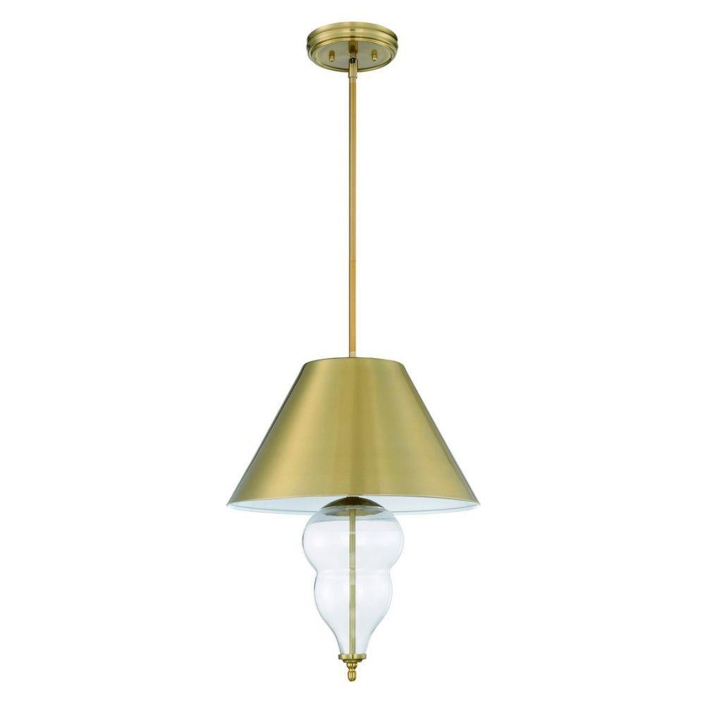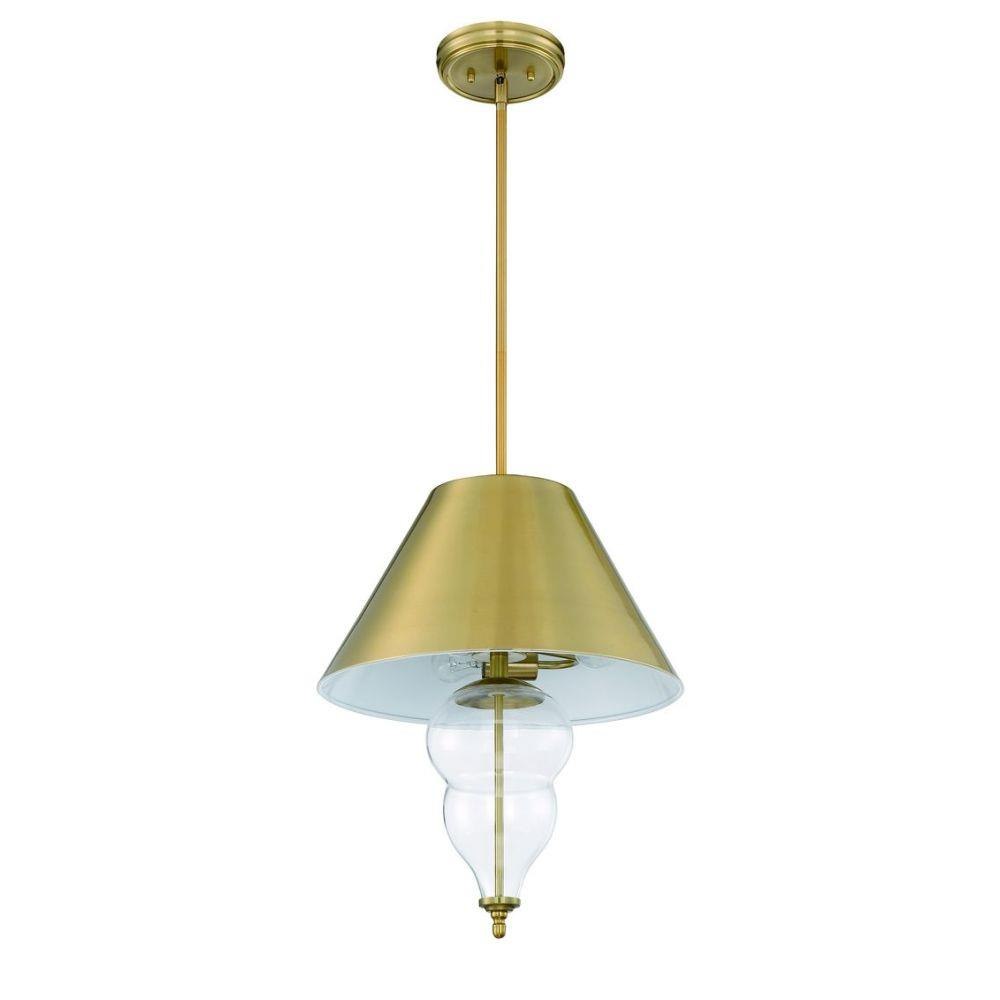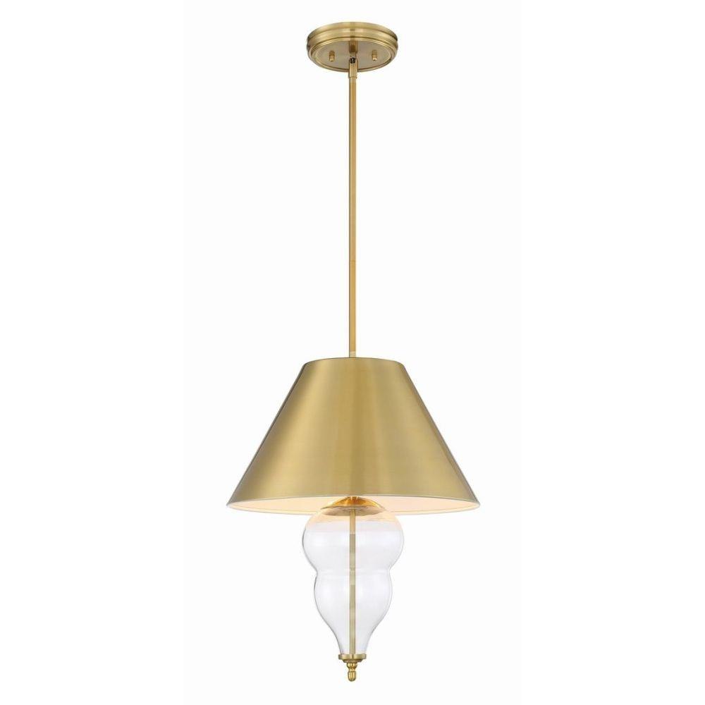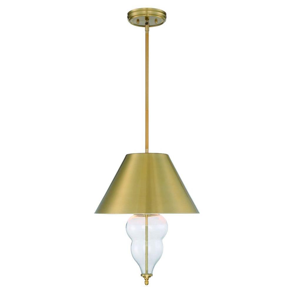 The Nabu three light pendant exudes refined elegance with a satin brass shade accentuating the graceful curves of the clear blown glass.