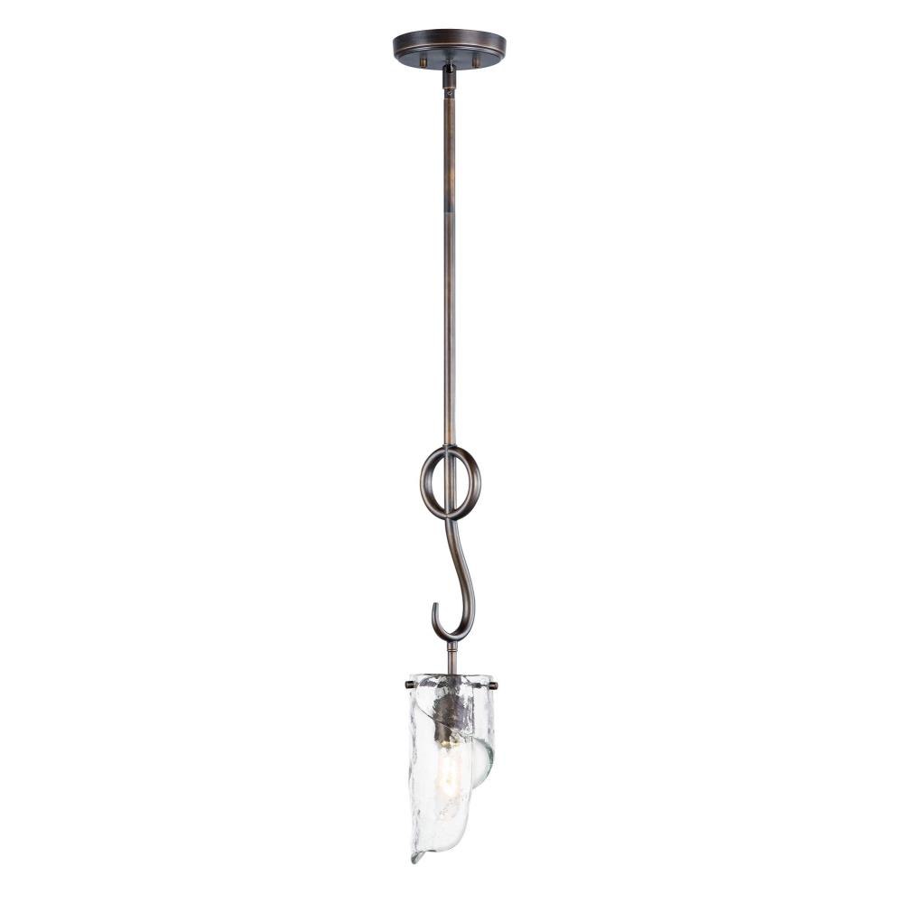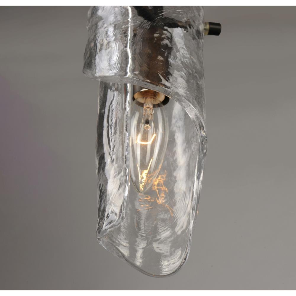 Forged arms finished in Chestnut Bronze are suspended in a mobile-like fashion to create an interesting work of art. Suspended from the hook at each end are beautiful hand formed Clear piastra-styled glass which adds elegance to this bold design.