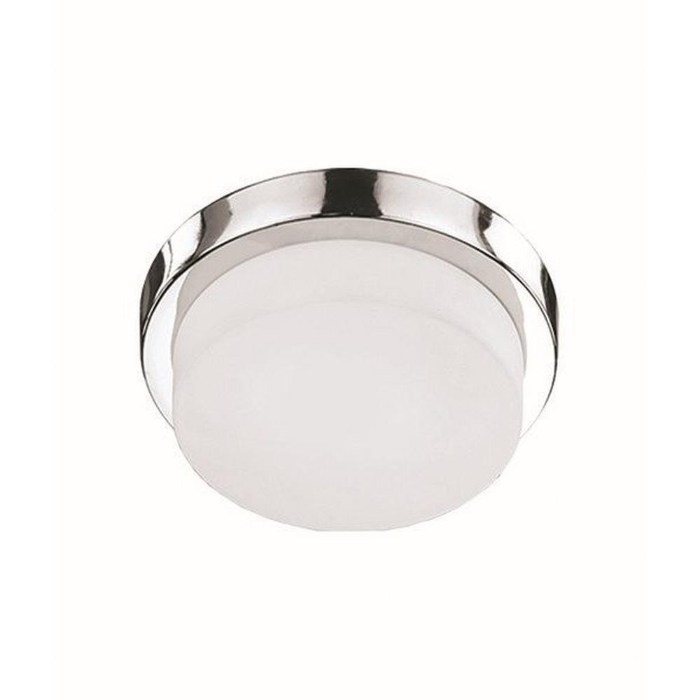Single LED flush mount ceiling fixture with round white opal glass. Metal details in brushed nickel or chrome finish.