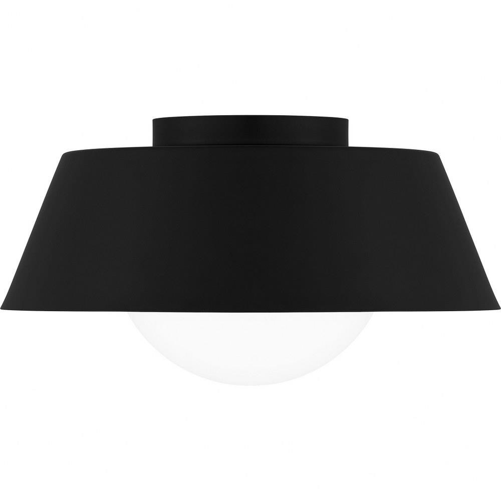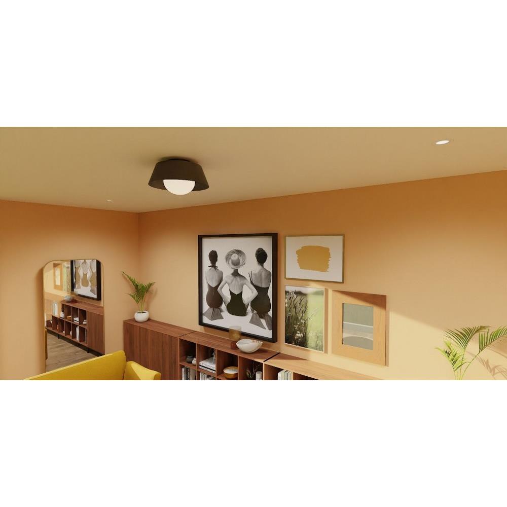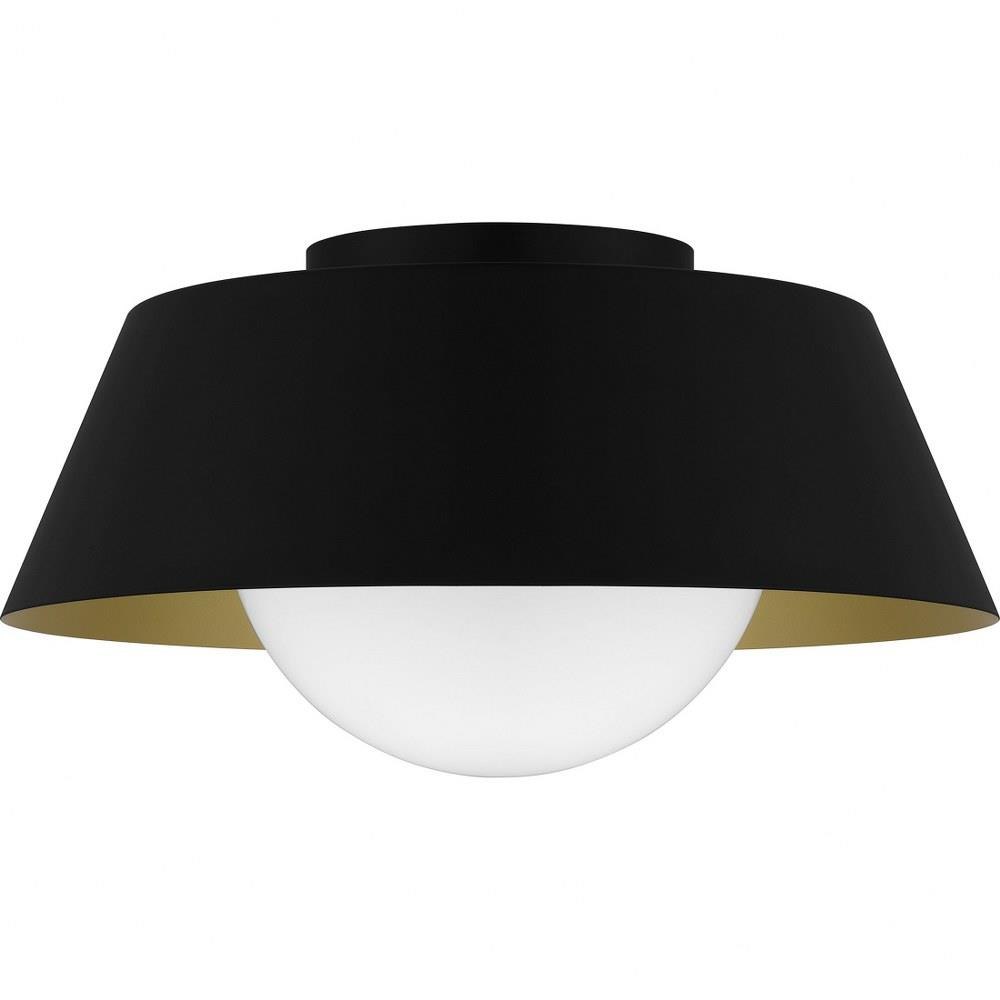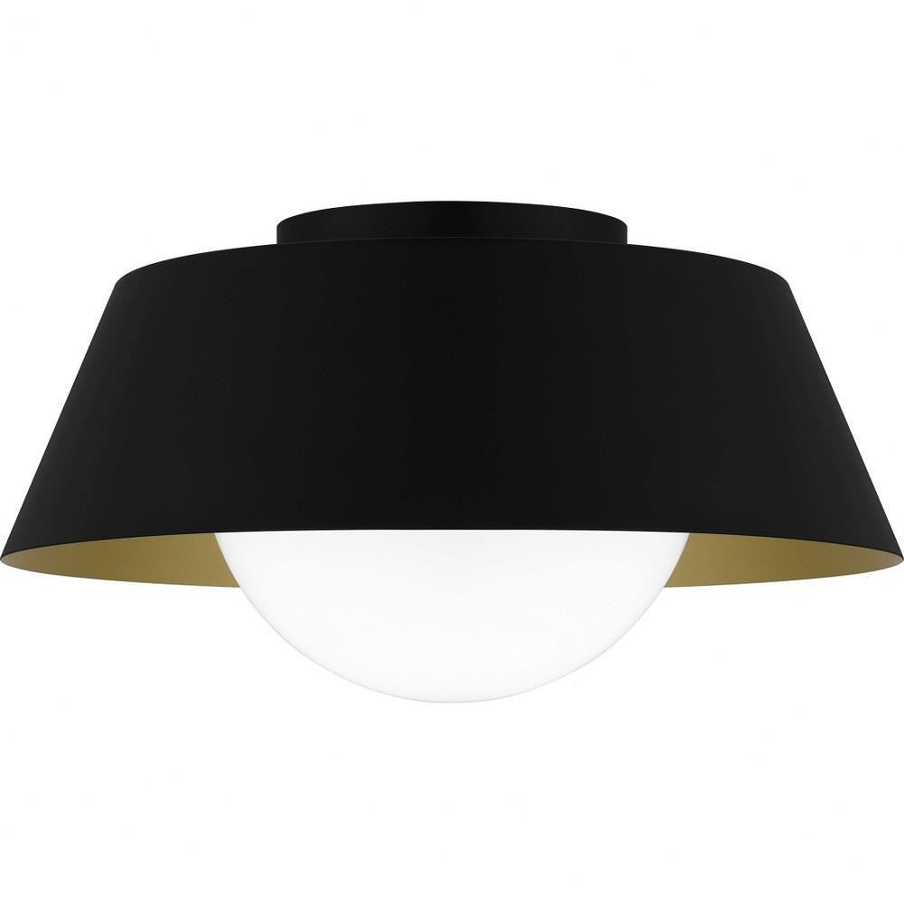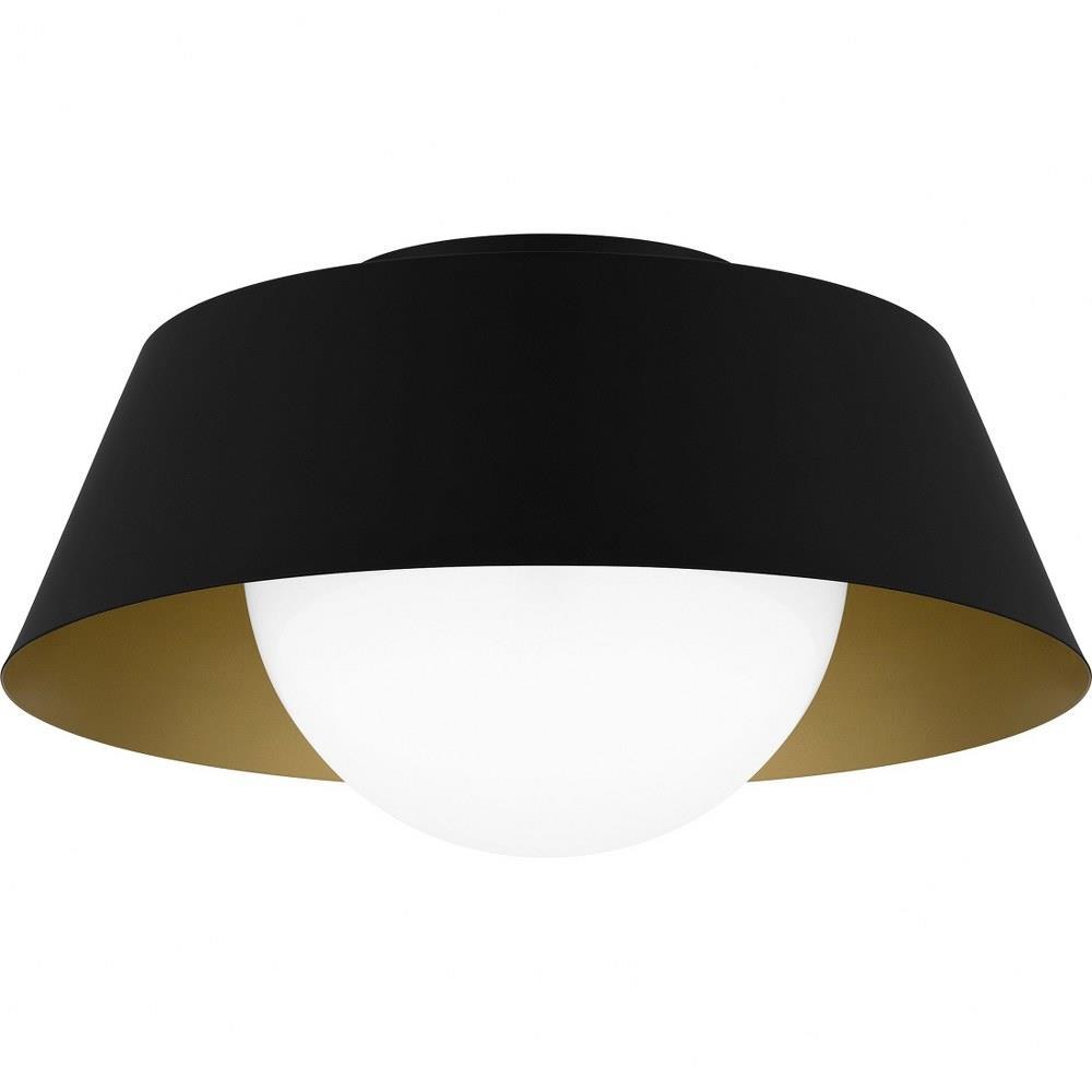 The transitional style of the Damascus flush mount is both sleek and modern. A simple drum silhouette is finished in matte black on the outside, painted with a warm brass interior for optimal illumination. An opal glass globe completes the overall look, making Damascus a perfect choice in any space.