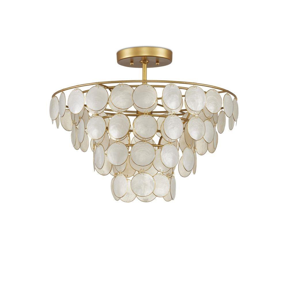 Ethereal in its make-up, the Bon Vivant Small Semi-Flush Mount was designed by Tom Caldwell. The discs that effervesce with illumination are made of Capiz shells ringed with a decorative metal edge. These match the contemporary gold finish on the rest of the fixture. The thinness of the wires that fasten the discs to the frame and to each other is a sophisticated design detail. This gold semi-flush is convertible to a chandelier when the lower canopy is removed.