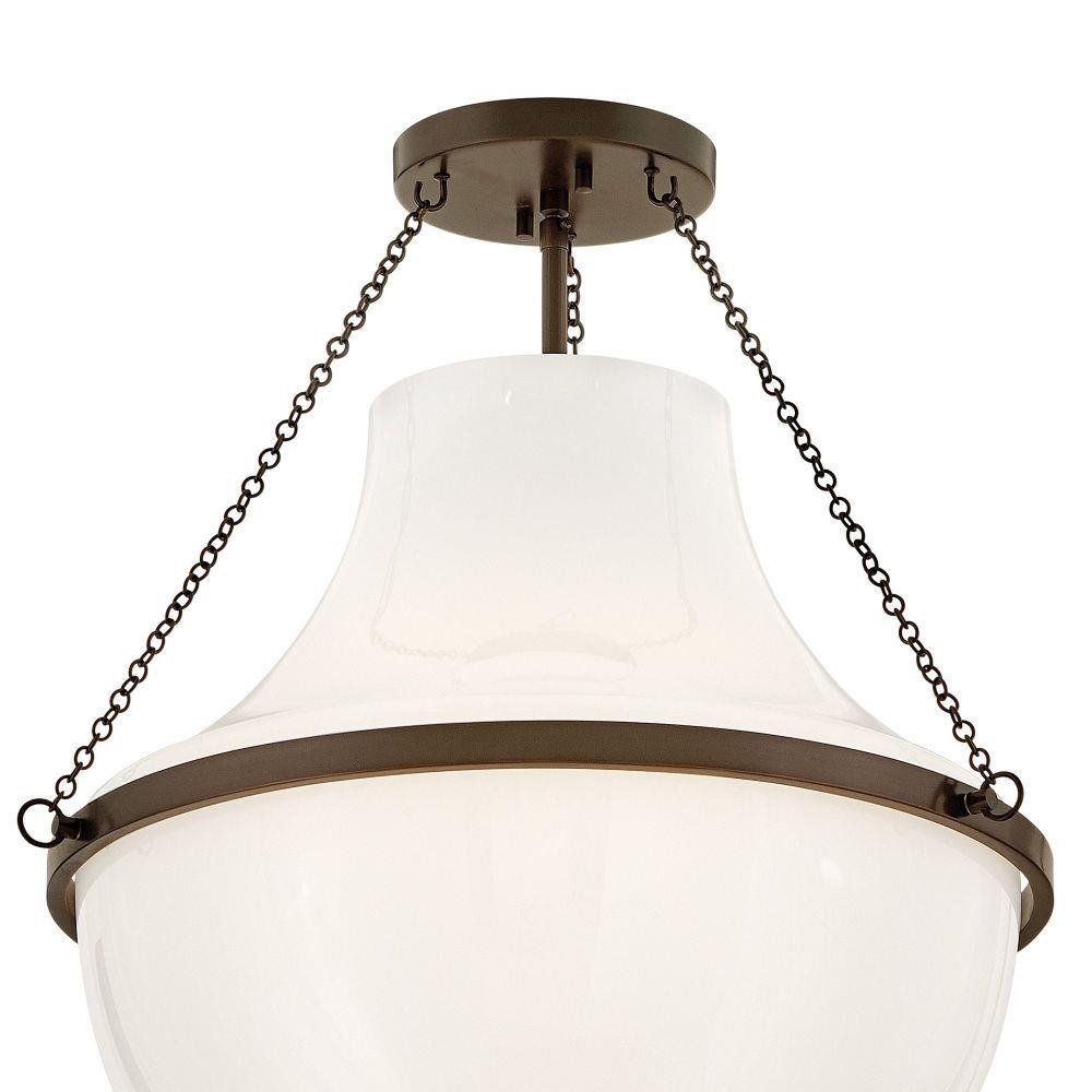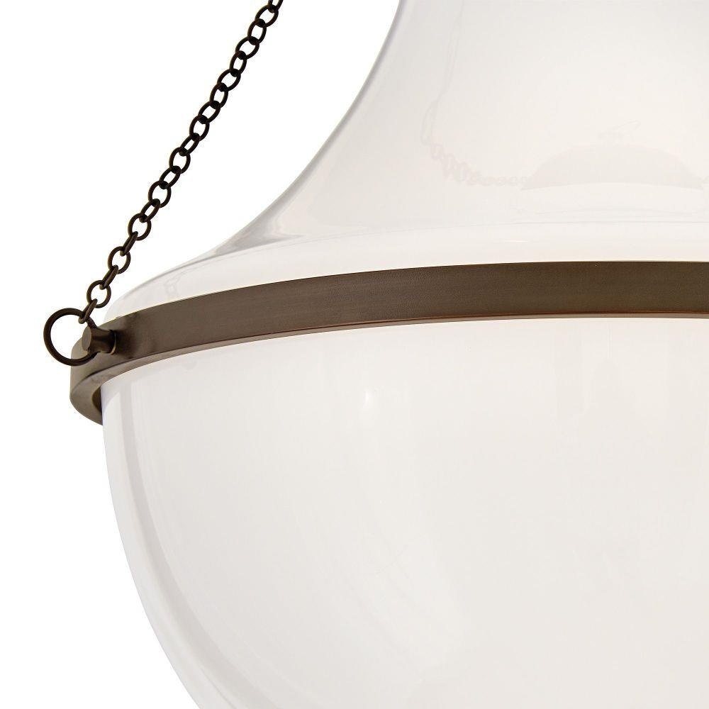 Fusing a sculpted, modern form with classically styled details, Collins features a transitional teardrop shade crafted from blown, Cased Opal glass. A central metal band and delicate chain uprights are available in Black Oxide, Heritage Brass, Heritage Bronze, or Polished Nickel finishes.