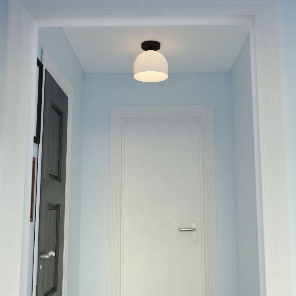 Illuminate your bedroom, bathroom, entryway, or hallway with the Shelby 1-light semi-flush mount celing light. Its classic design and matte black finish add a touch of timeless sophistication for both transitional and contemporary spaces. The elongated white dome-shaped glass shade emits a soft, diffused light, creating a warm and inviting atmosphere in any space.