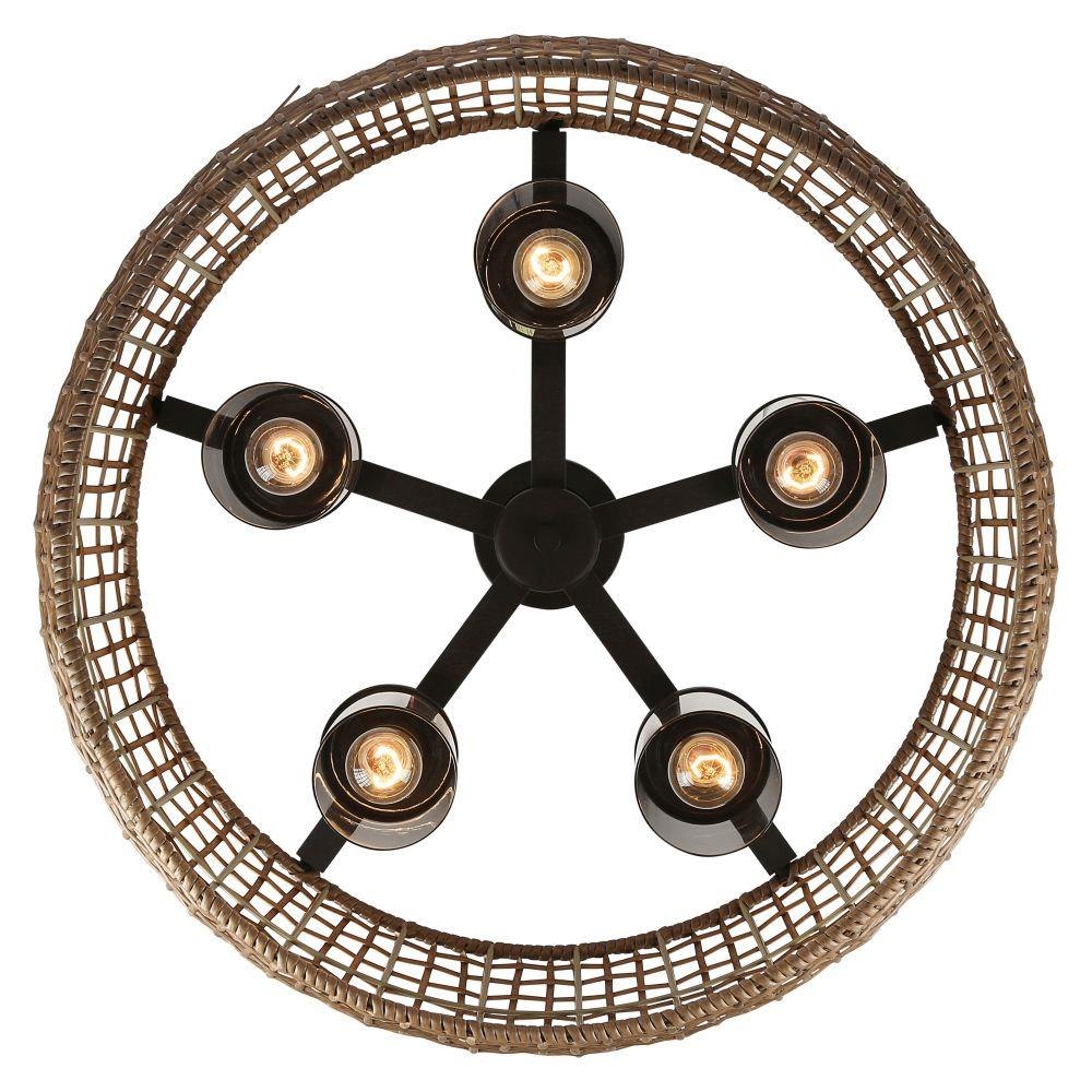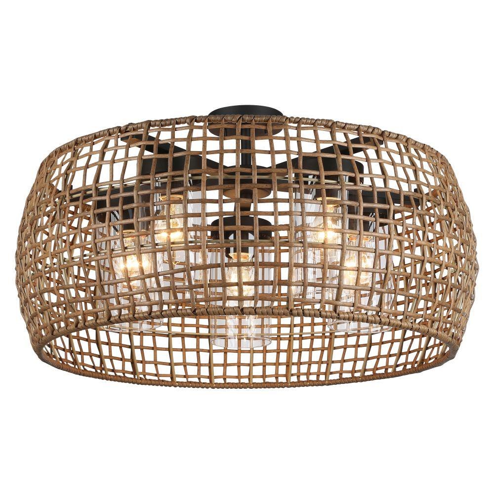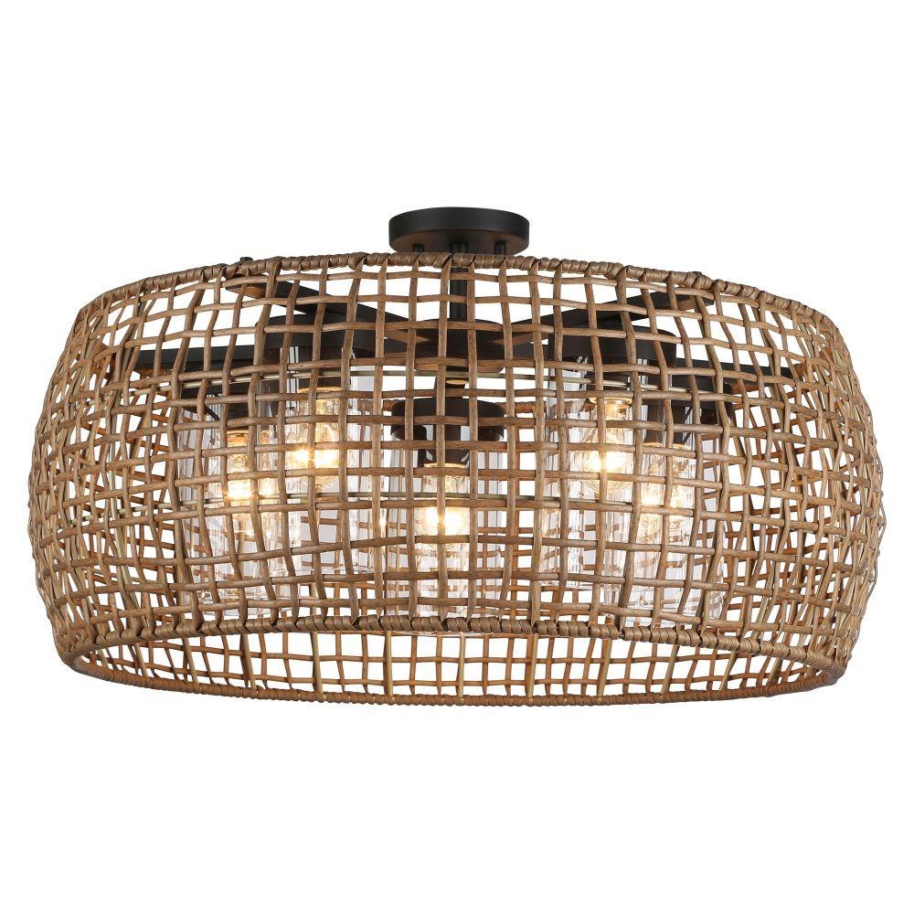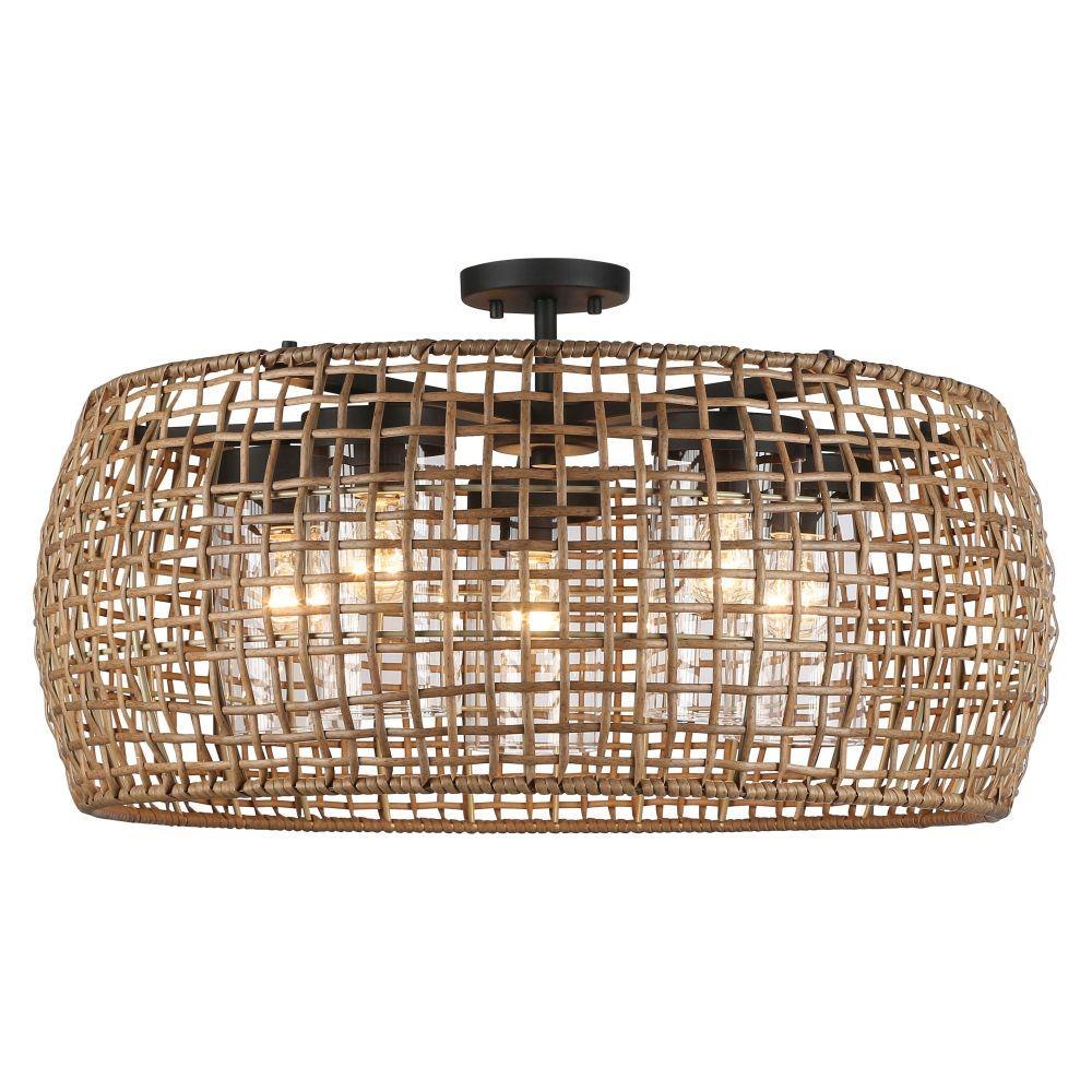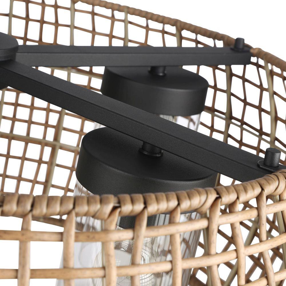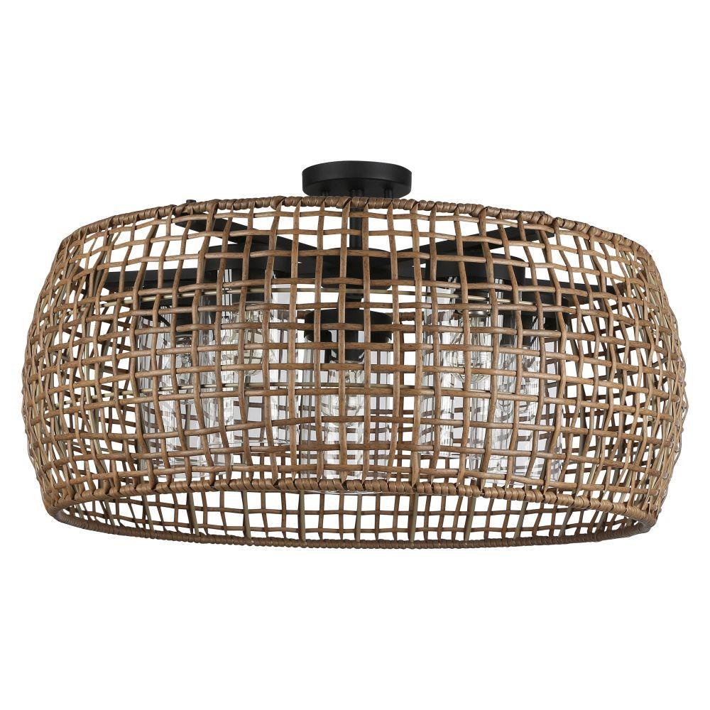Bring nature-inspired elegance into your home with the Golden Lighting Piper 5-light Outdoor Ceiling in Natural Black. Featuring a wicker shade and a natural black frame, it creates a welcoming atmosphere.The Maple All-Weather Wicker shade introduces a rustic bohemian charm, handcrafted from durable synthetic materials into a beautiful open-weave pattern, allowing for lovely light dispersion and a relaxed vibe.The soft natural black finish delivers a gentle look, offering versatility to suit a variety of styles, from industrial to transitional. Ideal for porches, gazebos, or outdoor kitchens, this fixture is wet location rated which means it withstands rain and snow, ensuring lasting beauty outdoors. The convertible design allows for installation as a semi-flush mount or pendant, with an adjustable height feature for perfect fit in any space. Overall dimensions are 27.5"W x 15.13"H x 27.5"D, requiring five E26 medium base bulbs (not included) with a max wattage of 100 each. Embrace this stylish fixture that effortlessly combines quality with exceptional design, illuminating your outdoor gatherings with a warm and inviting ambiance.