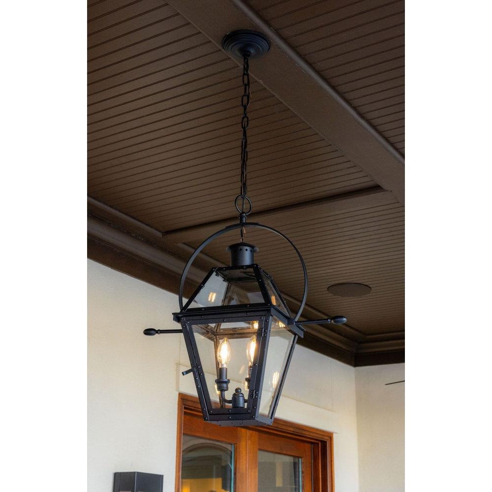 The Rue De Royal outdoor lantern collection offers the charm of a historic gas lantern with the ease of electric lighting. This lantern features a hand-riveted metal frame reminiscent of an antique gas lantern, complete with a fully functioning door for ease of use. Clear glass panels allow for maximum illumination, while the earth black finish adds a touch of sophistication and complements a variety of exterior styles.
