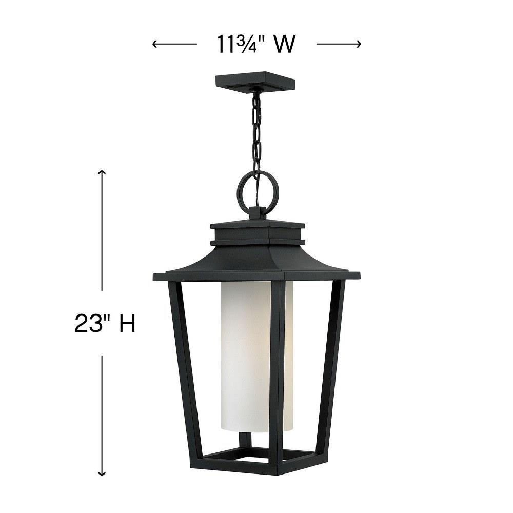 Sullivan’s clean transitional style features a minimalist cast aluminum body that frames the contemporary, candle-like etched opal glass. A large cast ring finial is mounted on top for a traditional finishing touch to this sleek lantern design.This chain or cable hung fixture may be installed on any sloped ceiling / Suitable for use in damp locations as defined by NEC and CEC. Meets United States UL Underwriters Laboratories & CSA Canadian Standards Association Product Safety Standards / Striking black finish enhances design / 2 year finish warranty / Sophisticated and streamlined design, durable construction and timeless finish complement any architectural style