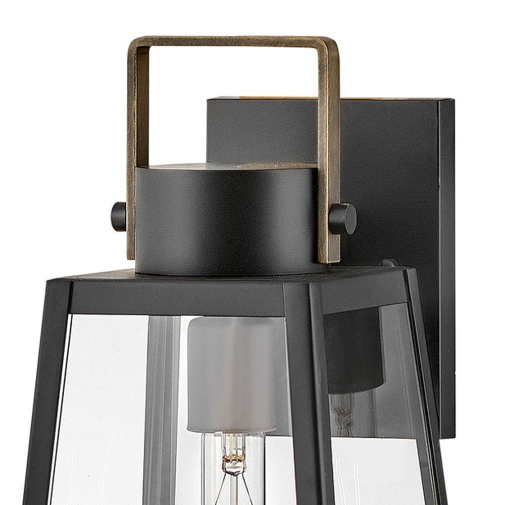 Hype up your alfresco area with the small Hugh wall-mounted outdoor lantern. Its sleek transitional 1-light design highlights the over scaled clear glass panes, framed by a luxe two-tone metal finish in classic Antique Brushed Aluminum with a matte Black accent. Pro tip: we recommend a tubular vintage filament bulb to make Hugh pop on porches, patios, or amp up any exterior space.