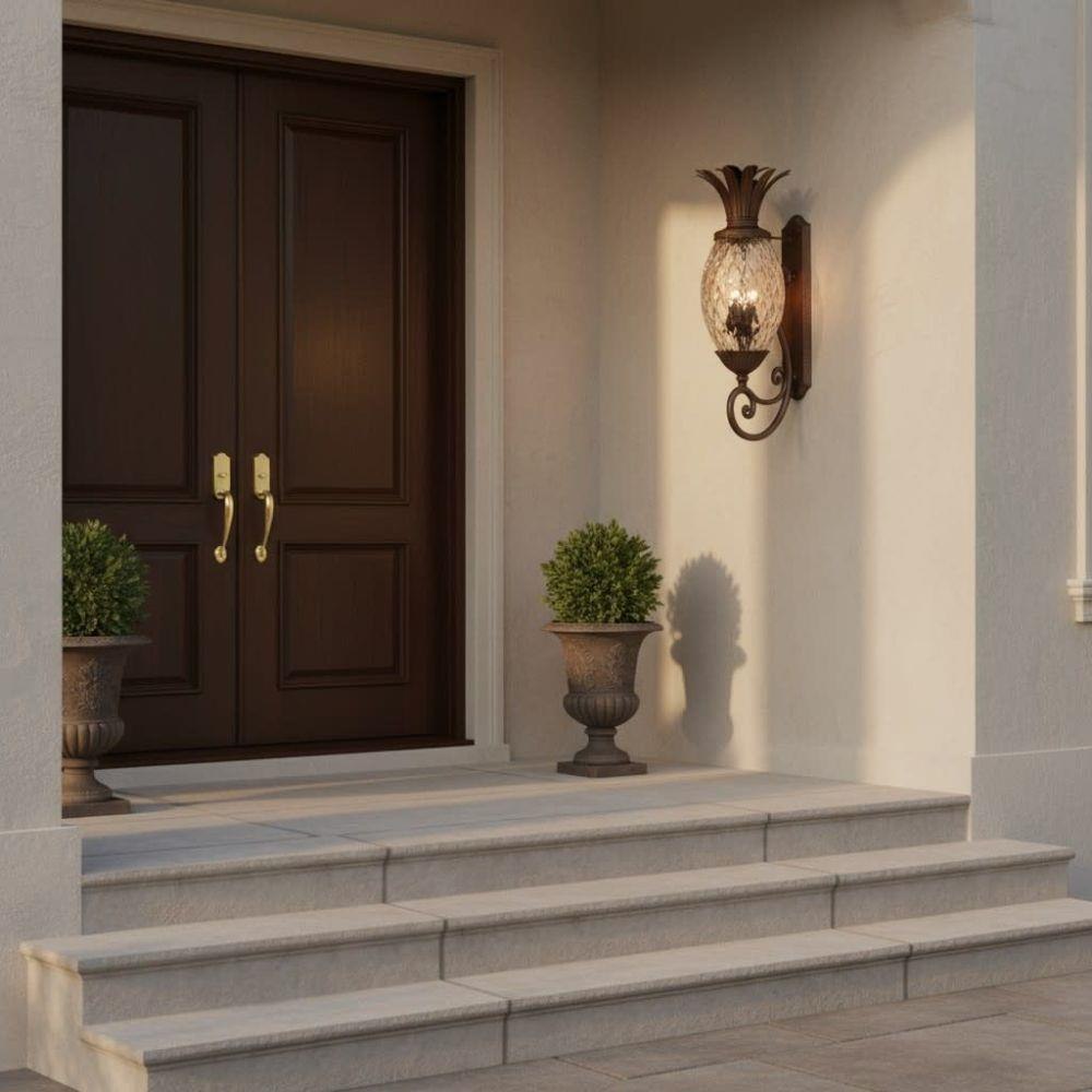 A Hinkley classic, the ornate Plantation collection features exceptional pineapple-shaped elements that make a noble statement. With elaborate, decorative cast detailing, the Plantation collection bestows sophisticated charm with the perfect hint of vintage glamour.Suitable for use in wet (outdoor direct rain or sprinkler) locations as defined by NEC and CEC. Meets United States UL Underwriters Laboratories & CSA Canadian Standards Association Product Safety Standards / Classic lines and heritage details complement traditional architecture / 2 year finish warranty / Bold and robust dark bronze finish
