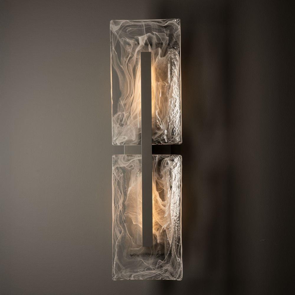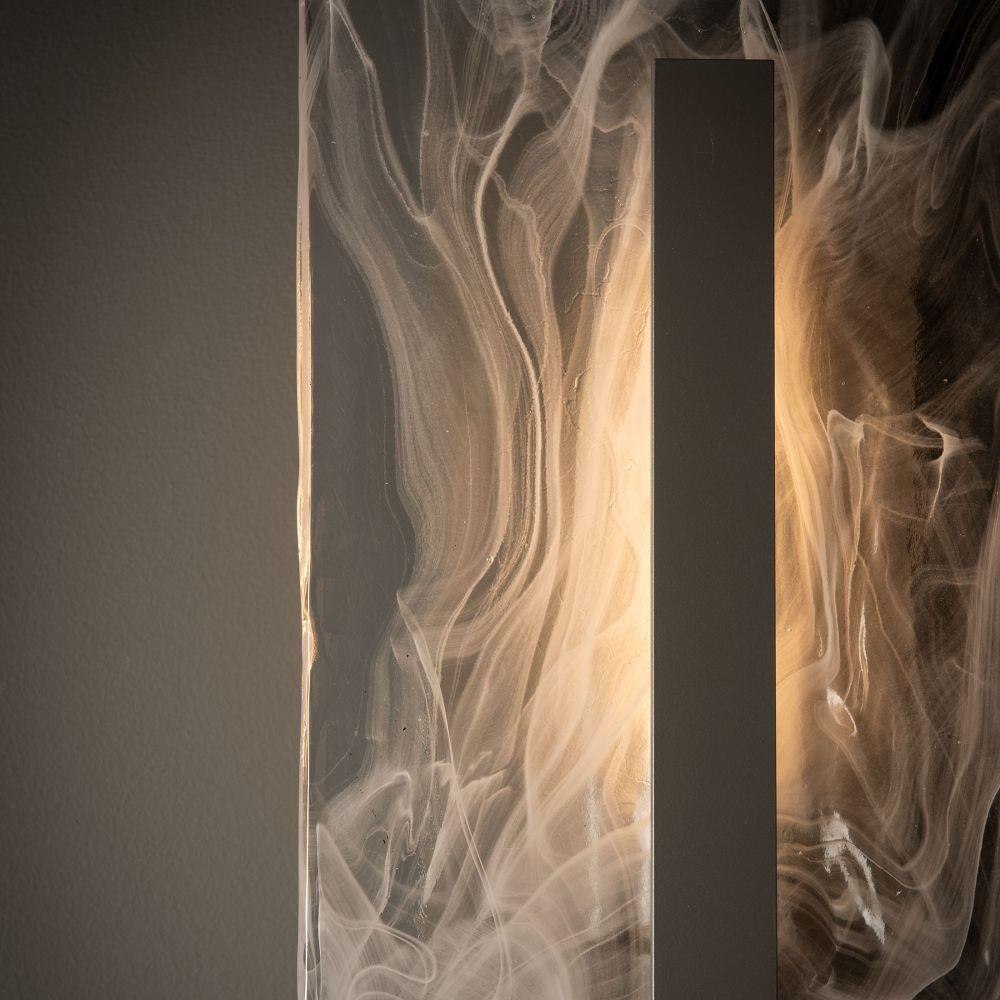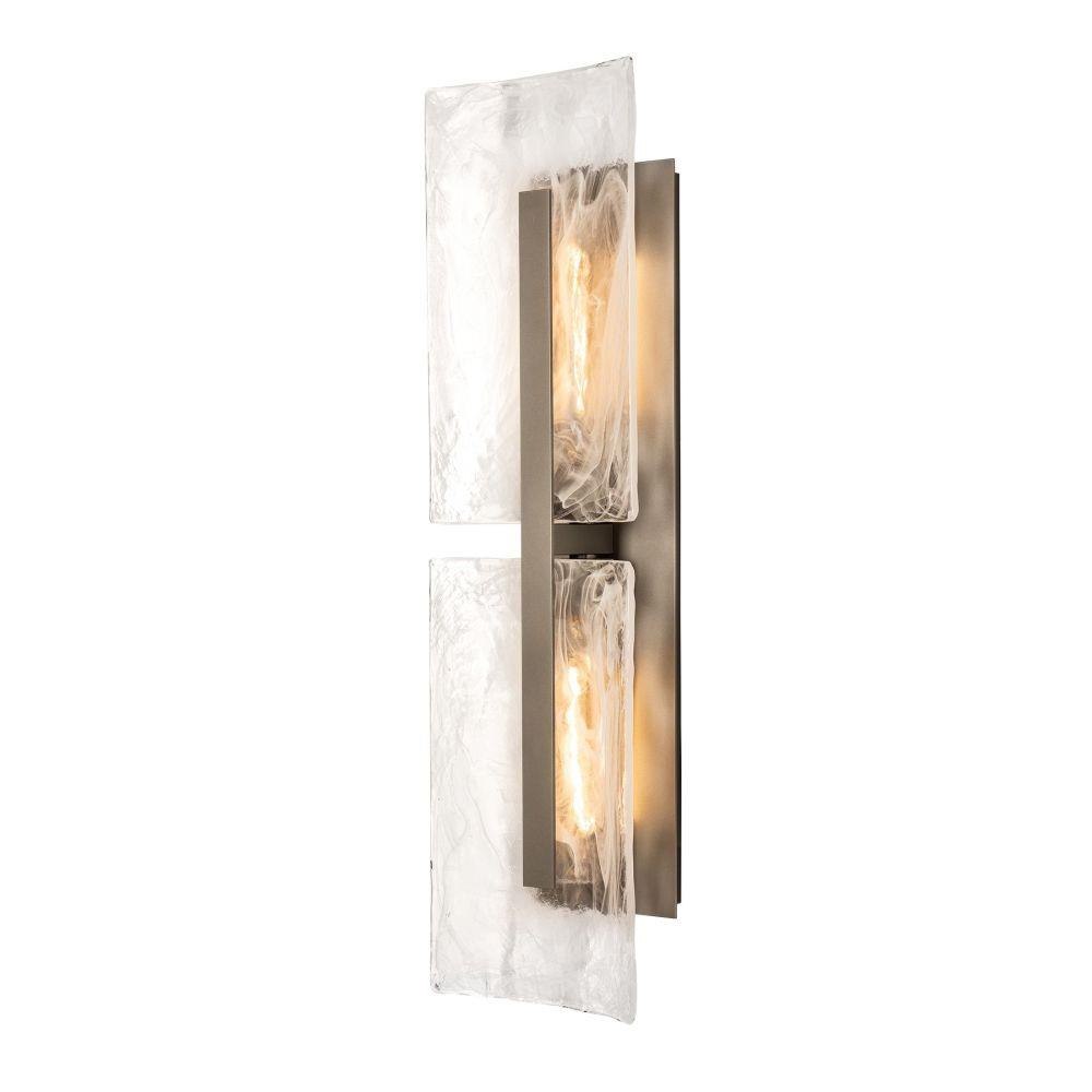 If you're looking to make a signature first impression, this Arc exterior wall mount has the scale and "wow" factor to do just that. This stunner is over 3ft tall. The Arc's hallmark thick, hand poured, slightly convex glass panels with freeform white "swirls” offer both depth and clarity. Its two tall glass panels are fixed to the backplate by a simple, yet elegant vertical aluminum bar. Made by Vermont artisans. Offered in any of our Outdoor Coastal Finishes and available in 2 Marine Grade options (small upcharge applies).