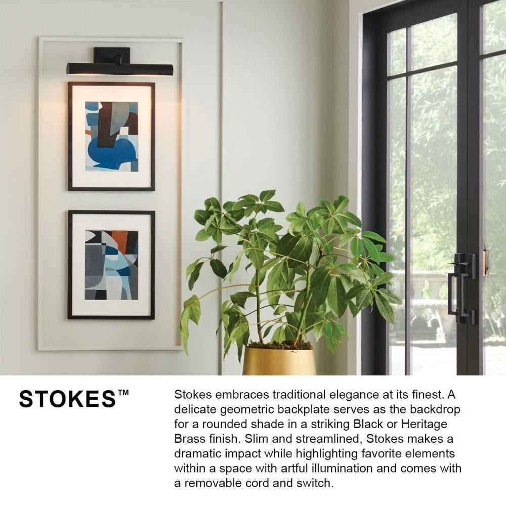 Stokes embraces traditional elegance at its finest. A delicate geometric backplate serves as the backdrop for a rounded shade in a striking Black, Heritage Brass, or Polished Nickel finish. Slim and streamlined, Stokes makes a dramatic impact while highlighting favorite elements within a space with artful illumination and comes with a removable cord and switch.