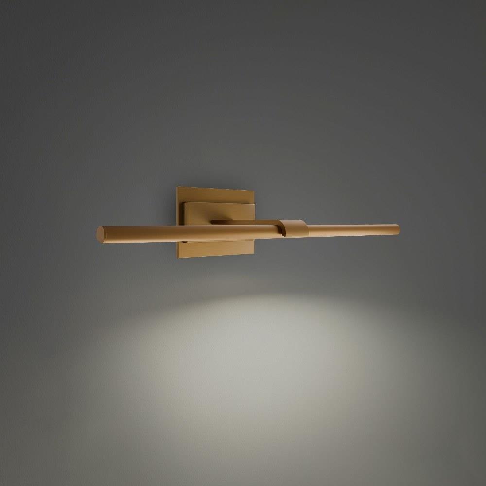 The Inlet picture light brings a magnetic connection to walls. A rounded bar fits seamlessly within its magnetic arm, allowing the picture light's head to rotate. The angle of the color temperature adjustable LED illumination can be perfectly adjusted to highlight artwork. Inlet is offered in 18, 24 and 30-inch sizes and is available in a choice of aged brass or black finishes.