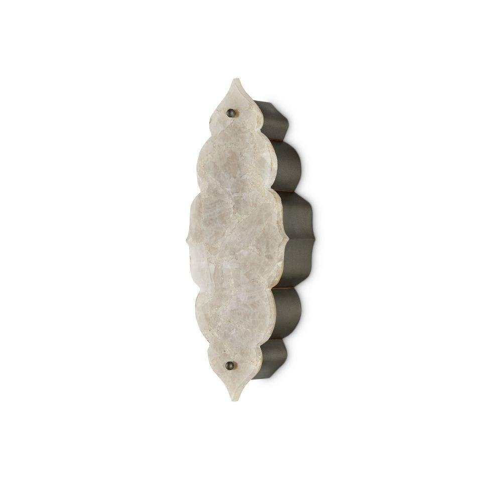 The Andalusia Wall Sconce is a gem of a fixture with its Moroccan-inspired shape and composite quartz stone covering the light source. The backplate and nuts that fasten the luminous shade to the sconce and the wall are in a Hiroshi Gray finish. The interior of the wrought-iron sconce is in a sugar white finish to enhance the glow. The sconce is ADA compliant.
