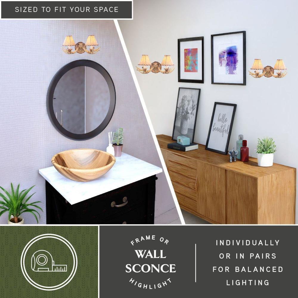Bring a little nature indoors with the Lodge collection. Its wild look is warm and inviting yet interesting and stylish. The fixtures are designed to replicate the textural elements of pine tree bark and wood. The sculpted antlers are realistically detailed. Faux leather shades with hand stitched elements complete the look. Everything combined makes this collection a great choice for a rustic vacation lodge, cabin or a suburban home. It will complement a variety of home styles: anywhere you want to bring in an element of nature. This wall sconce is ideal for bathrooms, hallways, stairways, and foyers.