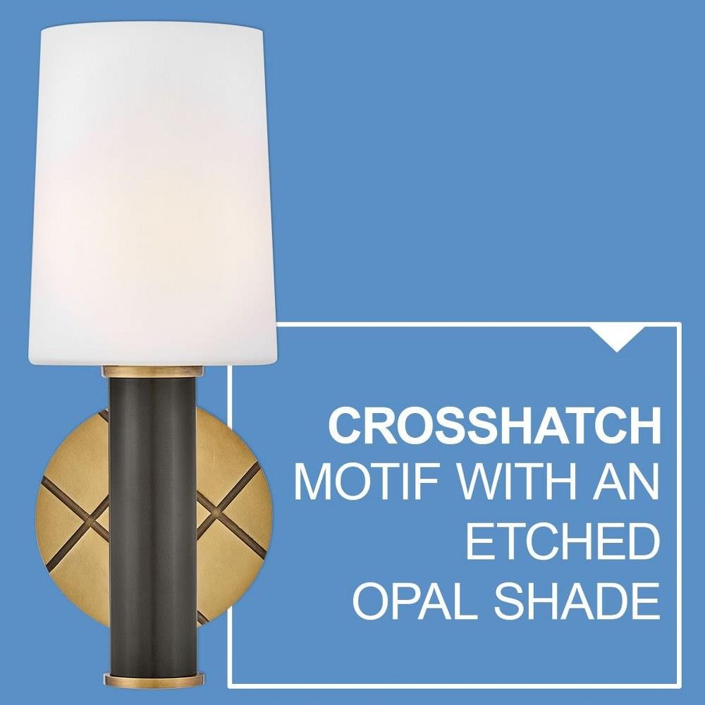 Featuring a geometric, crosshatch motif, Declan’s substantial silhouette is enhanced by a heavy cast backplate and stem accentuated by a contrasting, two-tone finish. A tall, tapered, etched opal glass shade creates softly diffused illumination and a comfortable atmosphere.