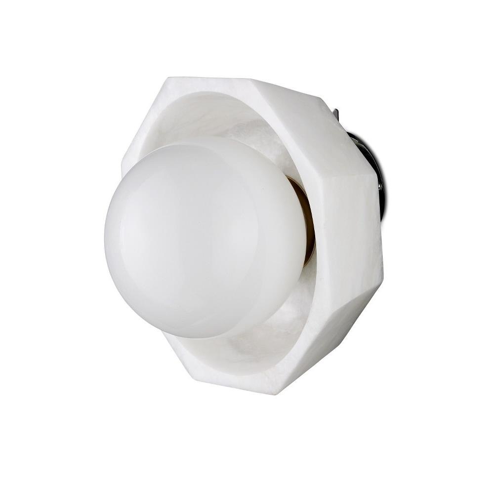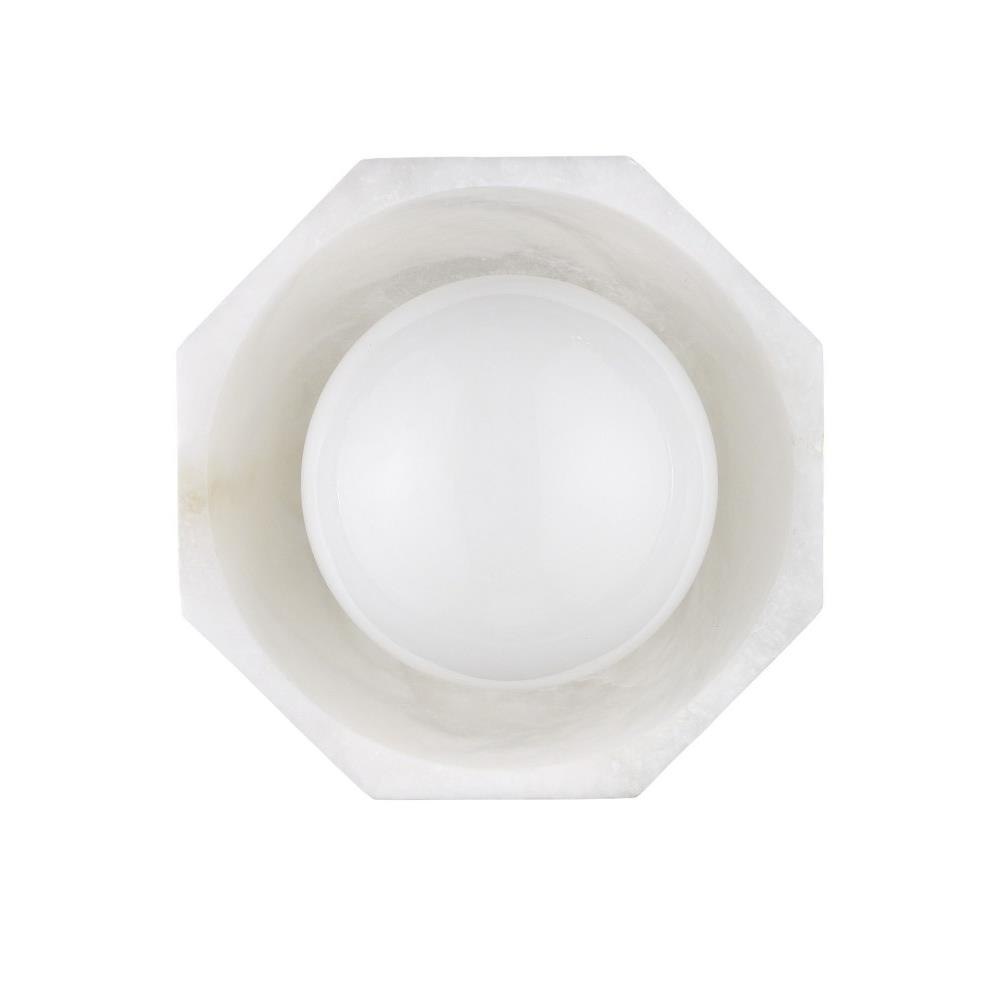 The Waystone White Wall Sconce is fitted with a large globe bulb that illuminates a bowl made of natural alabaster. The prized material has been hollowed out and carved into an octagonal shape. This alabaster sconce will gleam beautifully from its spot on the wall.