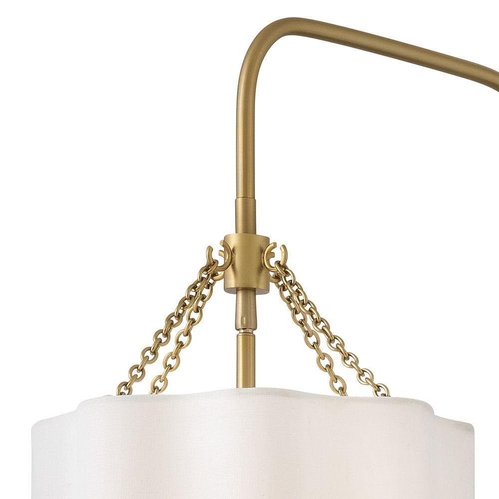 Splendidly soft, Gwen’s shapely scalloped shade complements inviting light with elegant layers of off-white linen suspended from delicate chains and minimal metal stems. A Black or Lacquered Brass finish provides a versatile complement to any interior style.