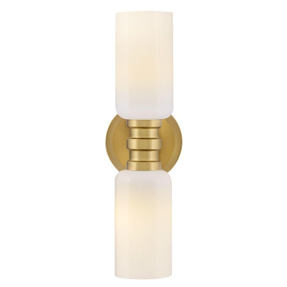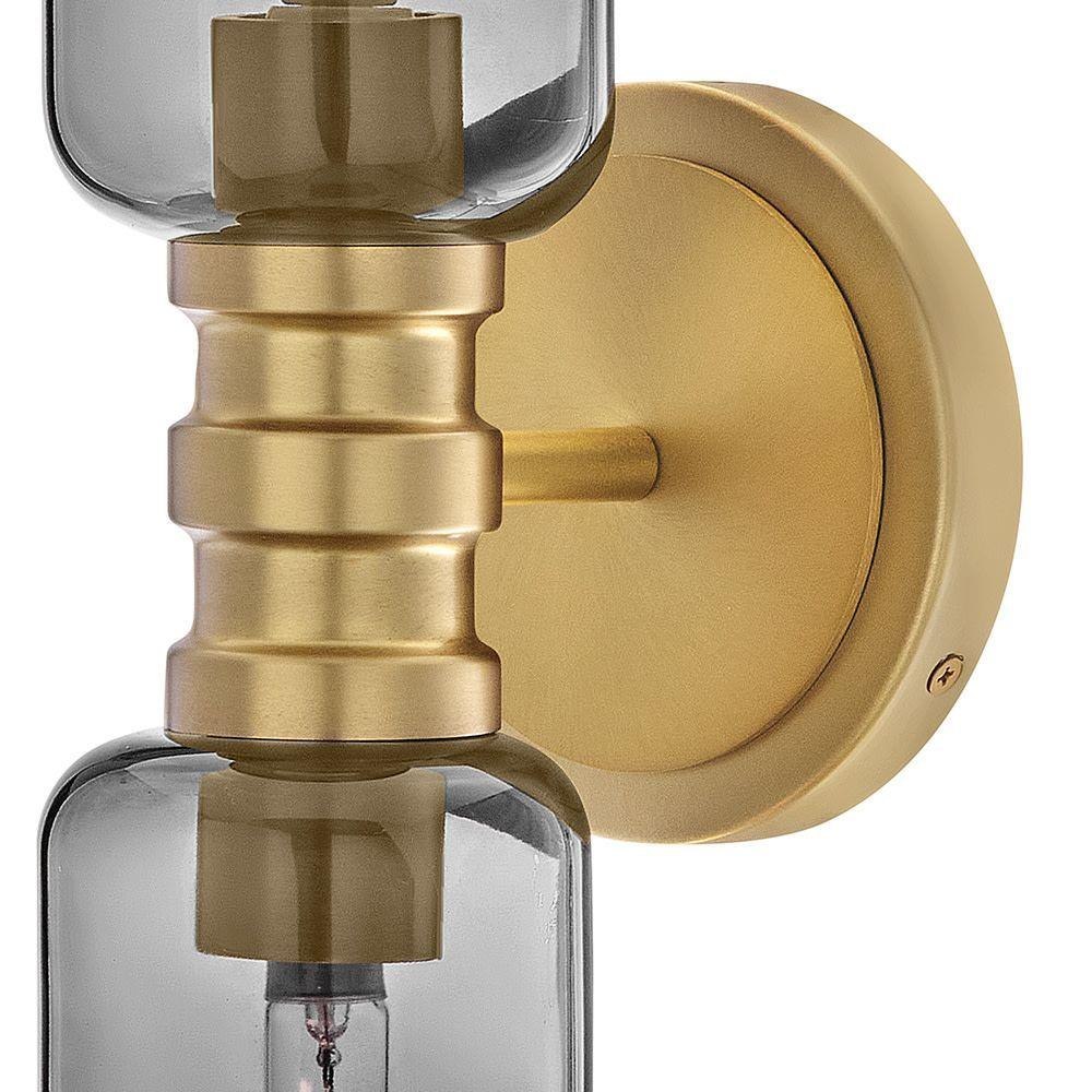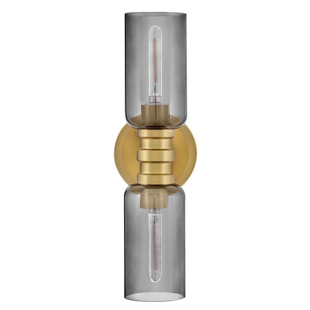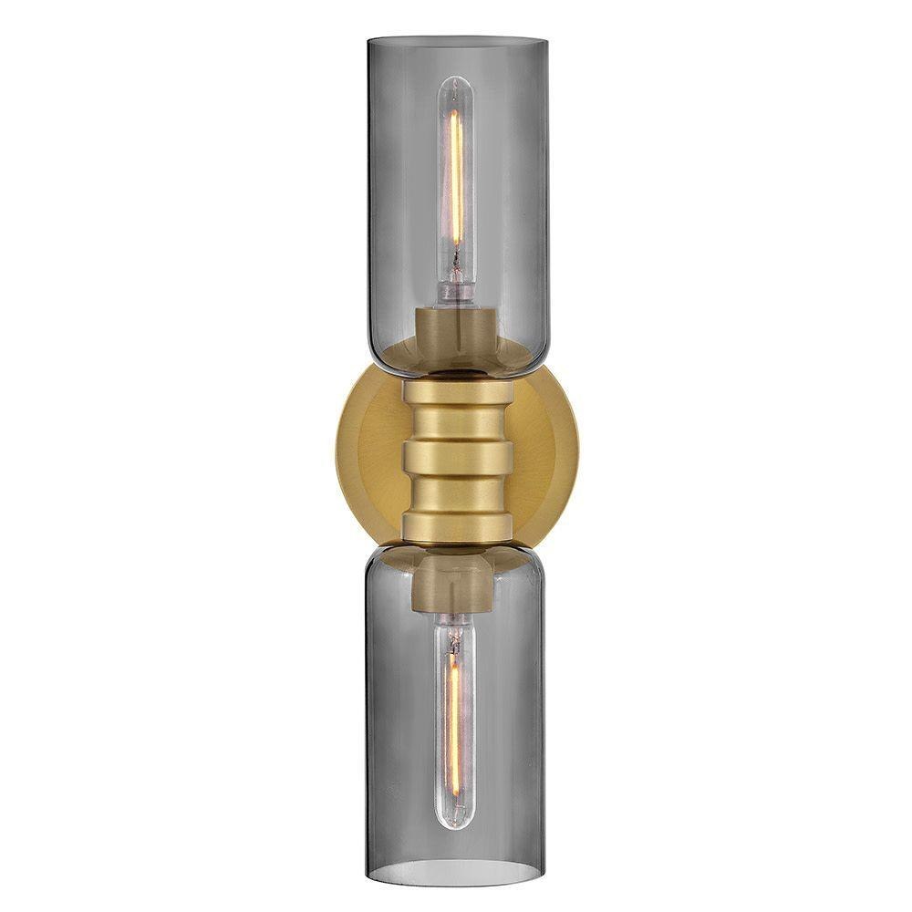 A refined bathroom icon, Naomi’s luxe profile features cylindrical cased opal or smoked glass complemented by a warm Lacquered Brass finish. A bold center cuff accented by soft details brings subtle style to your powder room.