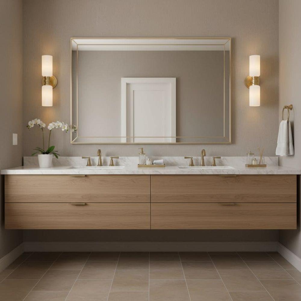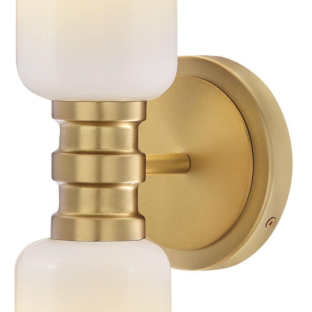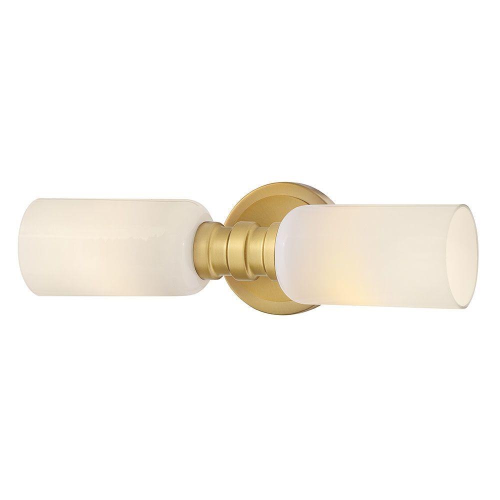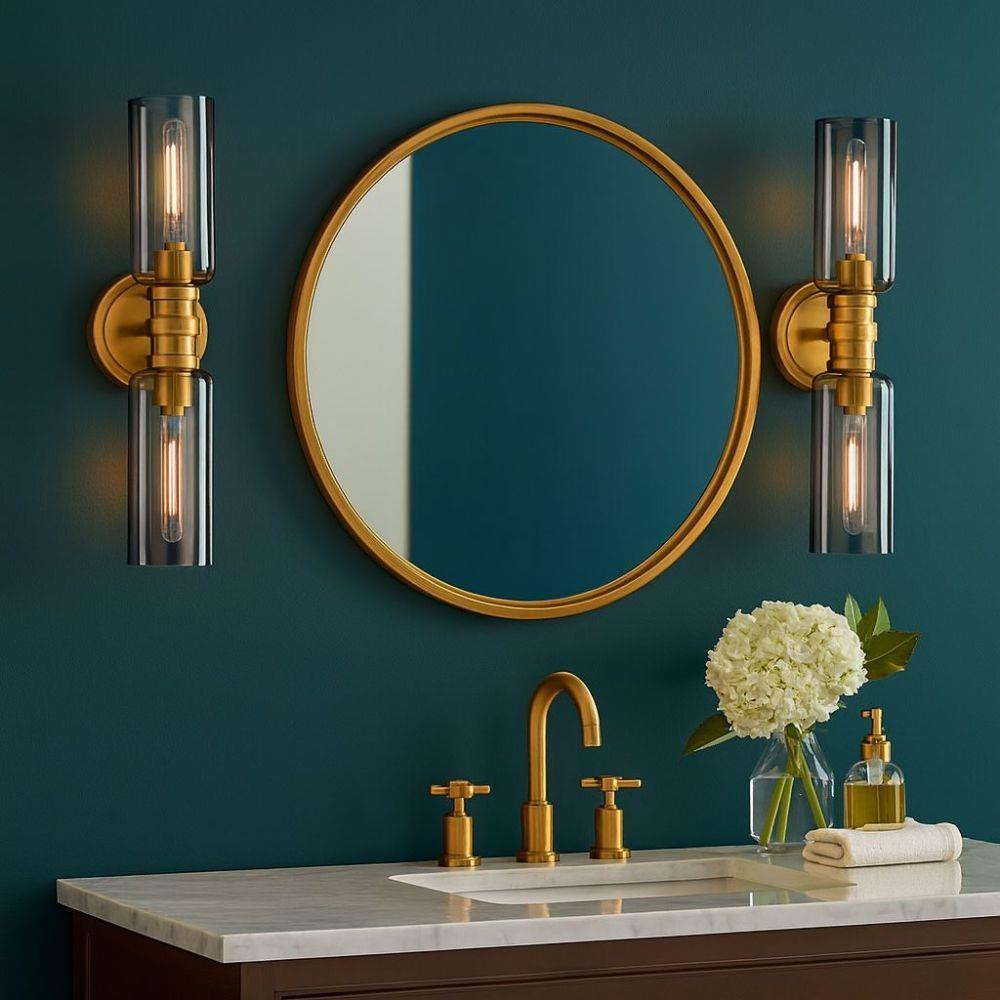 A refined bathroom icon, Naomi’s luxe profile features cylindrical cased opal or smoked glass complemented by a warm Lacquered Brass finish. A bold center cuff accented by soft details brings subtle style to your powder room.