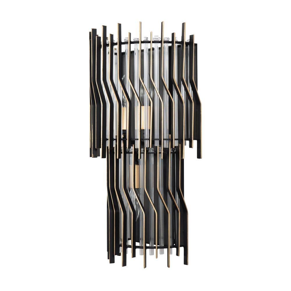 Inspired by the elements of New York City’s Brooklyn Bridge, the Park Row collection is sure to bridge the gap between functionality and inspired design. The Brooklyn Bridge’s neo-Gothic stone towers support a hybrid cable-stayed/suspension bridge design, with both vertical and diagonal suspender cables, which are the inspiration for Park Row. The interwoven cables create a repeating pattern that we have wrapped around and support modern clear fluted, recycled glass rods. The collection is hand-forged from 70% recycled steel. Hand-finished in matte black with French Gold edges.